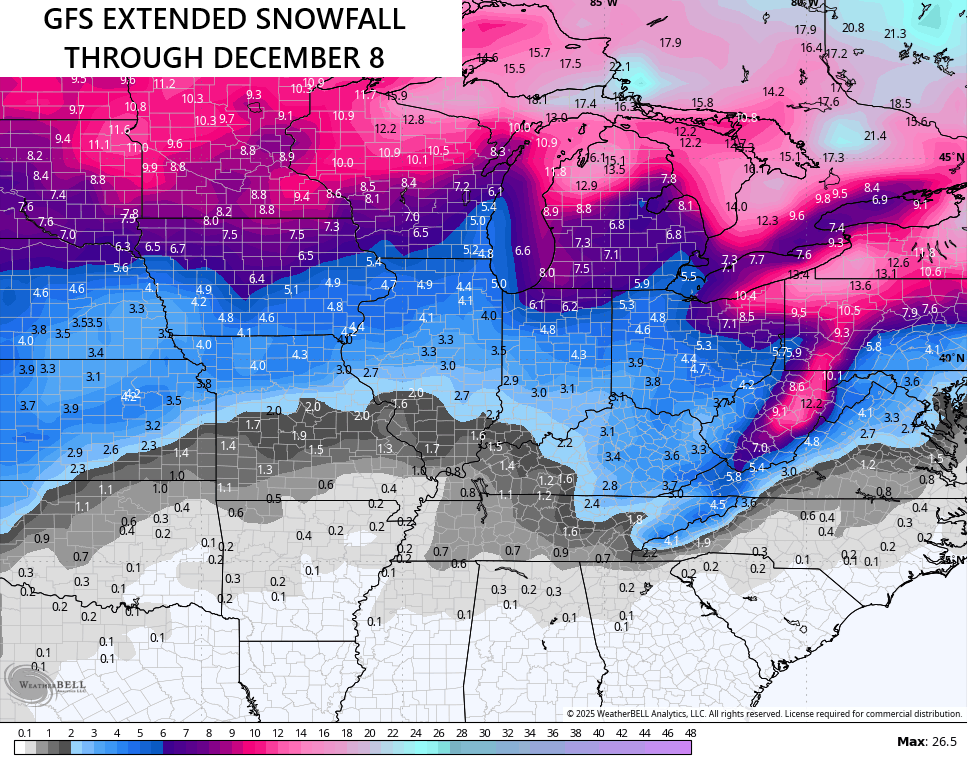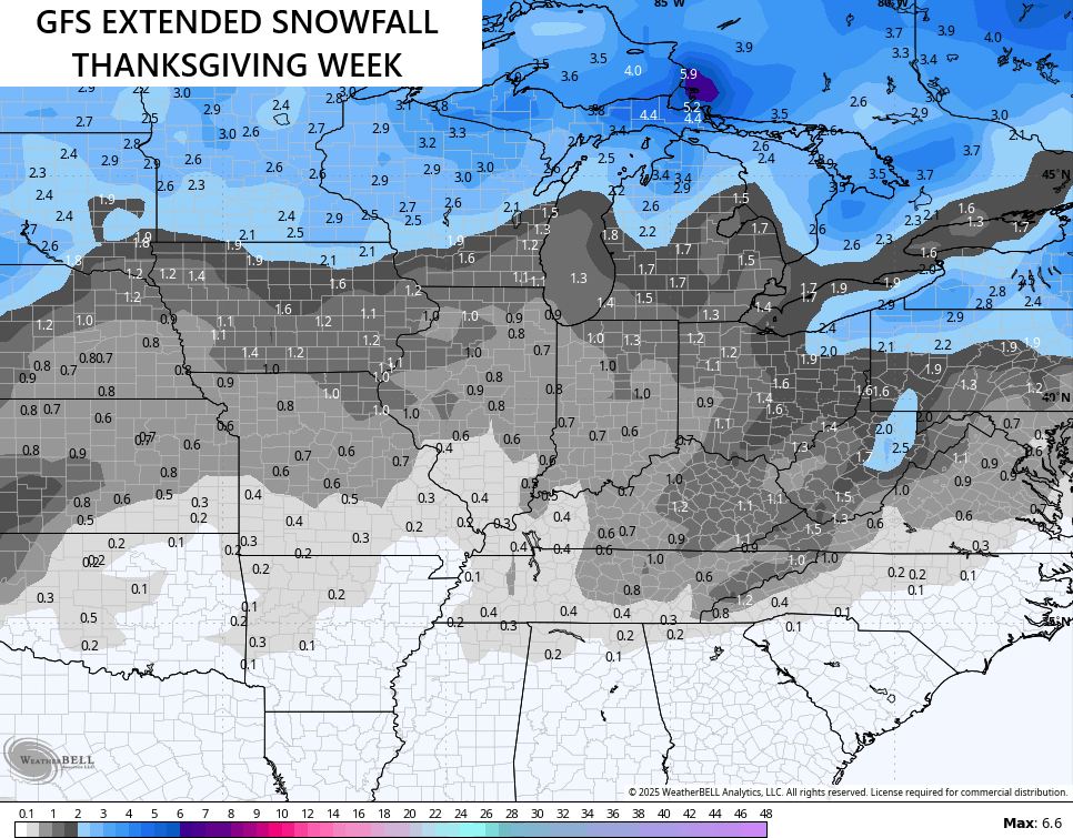 The GFS Extended doesn’t go out as far as the EURO Weeklies, but it still shows some pretty good snow chances showing up into early December…