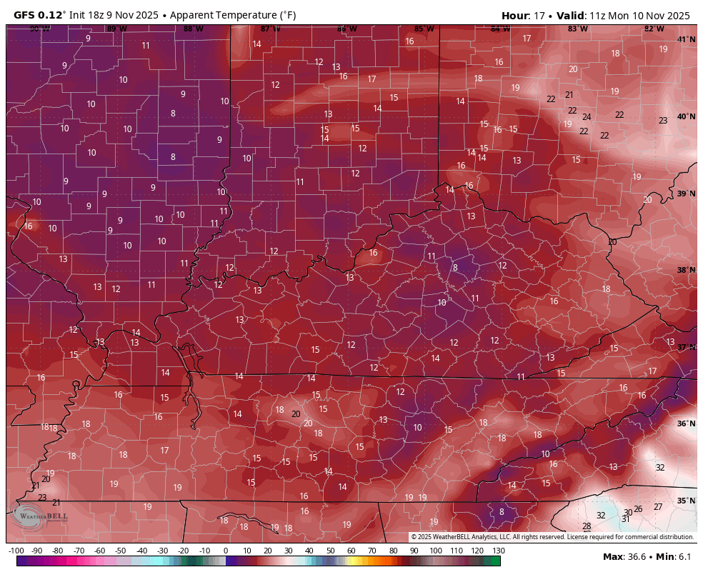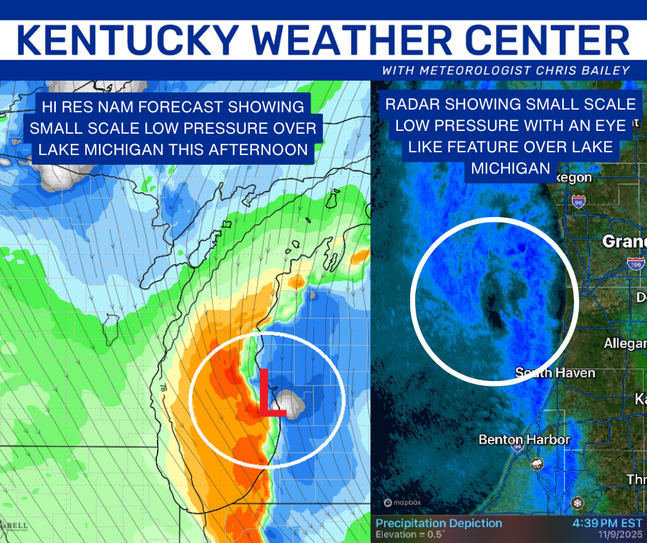 That small low is associated with the potent upper level system and it’s heading our way. That same small scale low spins across Kentucky Monday and brings a big increase in snow showers and squalls.