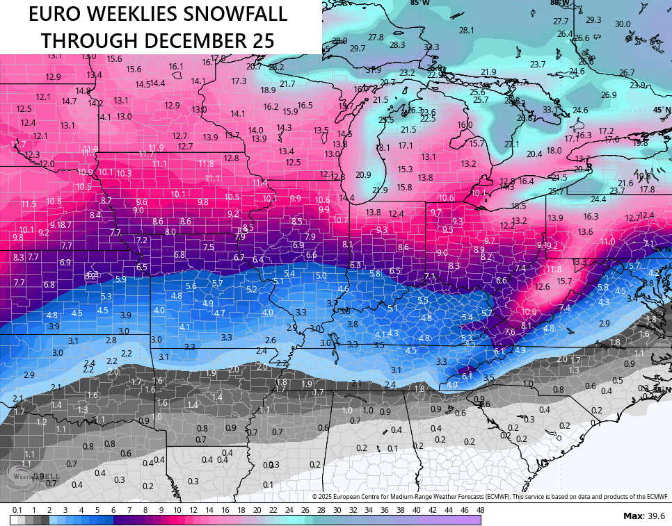 The average snowfall forecast from the 101 members that comprise the EURO Weeklies looks like this…