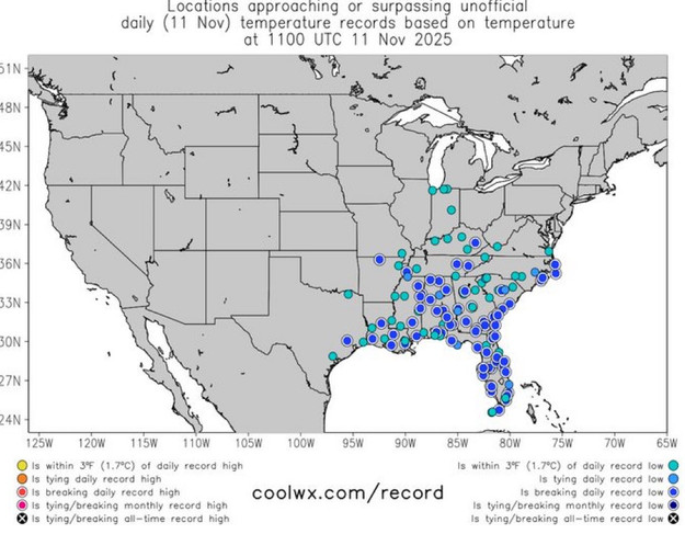 Speaking of the cold, our recent cold is crazy for this time of year around here and much of the eastern half of the country. The deep south took it on the chin this morning with record lows falling all over the place…