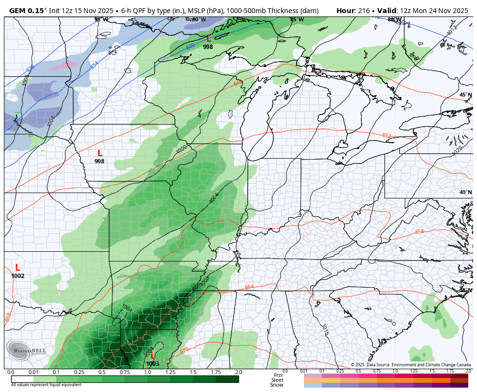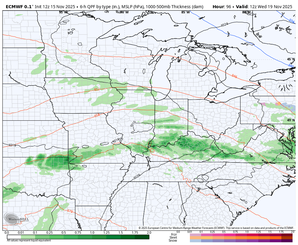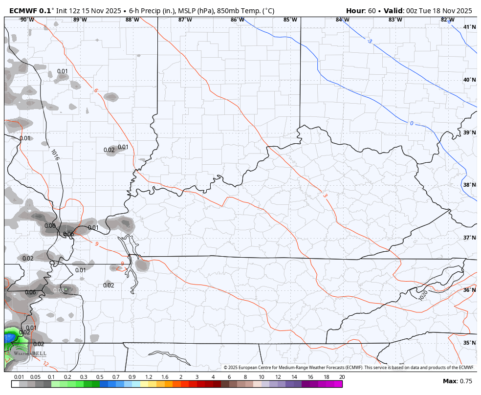 A west to east boundary sets up across Kentucky from Monday night through Wednesday. This allows for low pressure to roll along this boundary that features a near 30 degree north-south temp gradient on either side of it. It’s possible to have southwestern Kentucky in the 70s with northeastern Kentucky in the 40s.