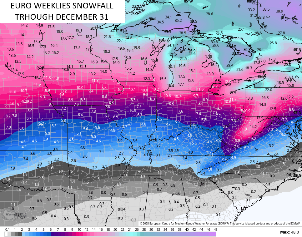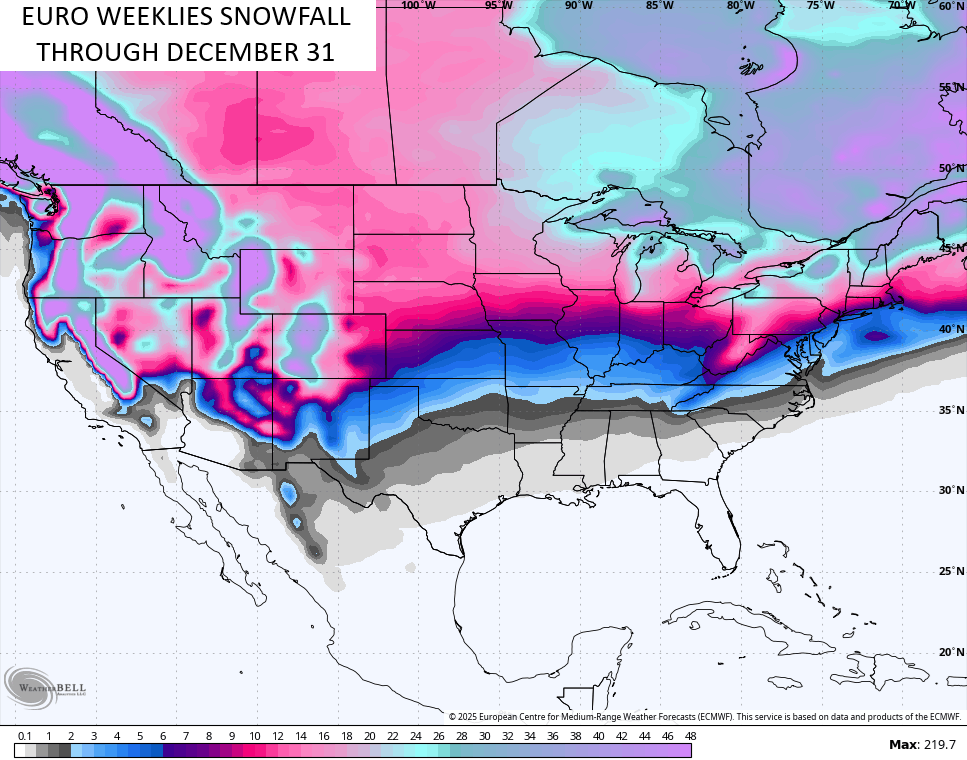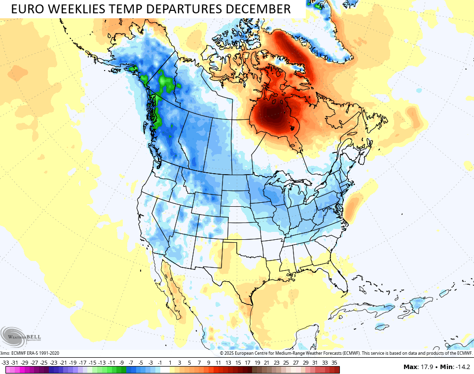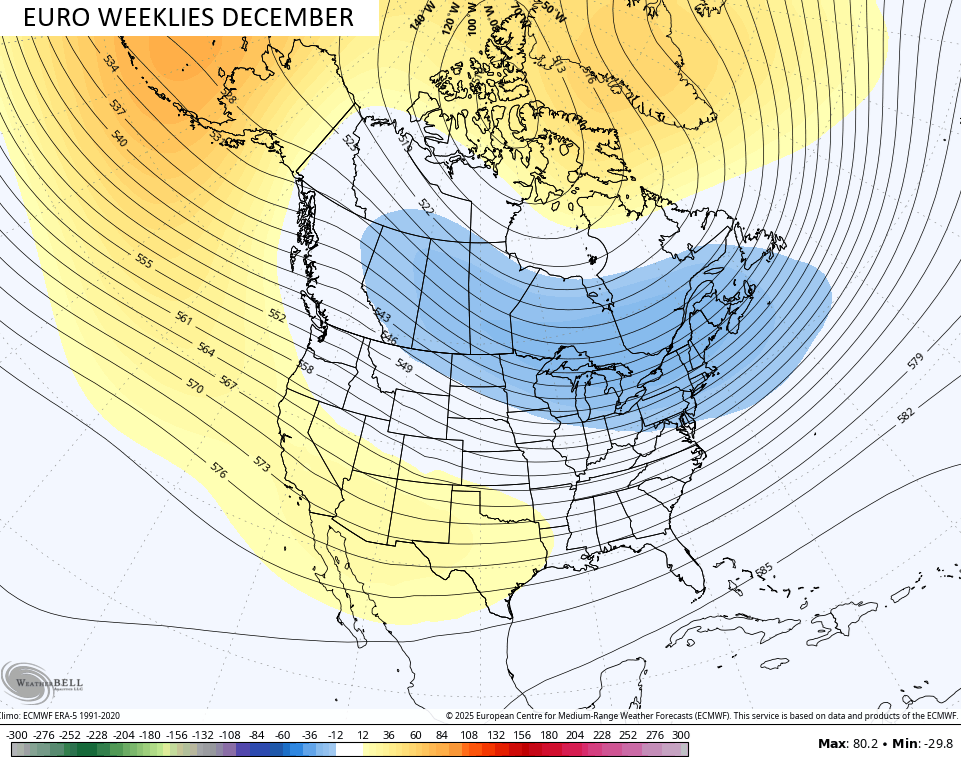 That high latitude blocking is really showing up during this time with the prospects for it to really increase into December and January. The latest from the EURO Weeklies now go through the entire month of December and they are locked in on a rocking December. That’s a textbook winter look for a 30 day average…