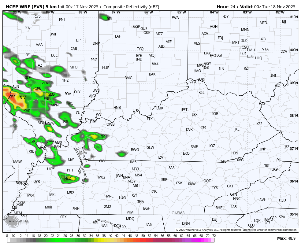 The end result will be some pretty good showers and storms rumbling through here tonight through early Wednesday. This shows up well on the WRF Future Radar animation that starts at 7 tonight and goes through 7am Wednesday…