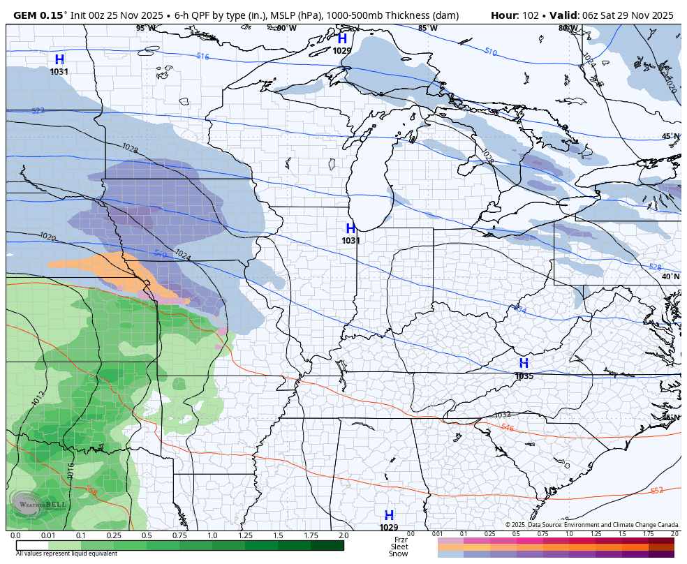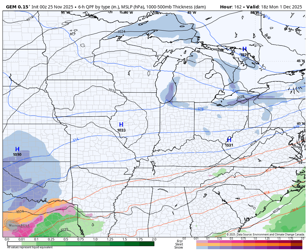 Another storm system follows that up quickly early next week with the models all showing something entirely different. Still, most have more of a winter weather signal with this. Here’s the Canadian from late Monday through Wednesday…
