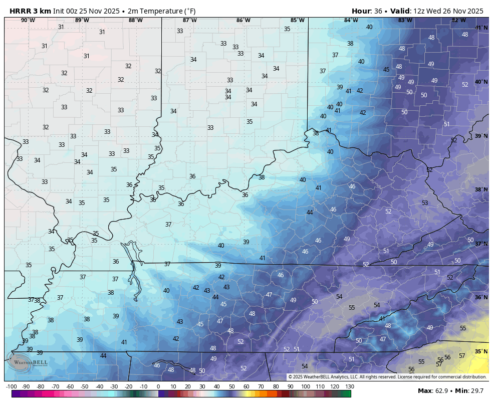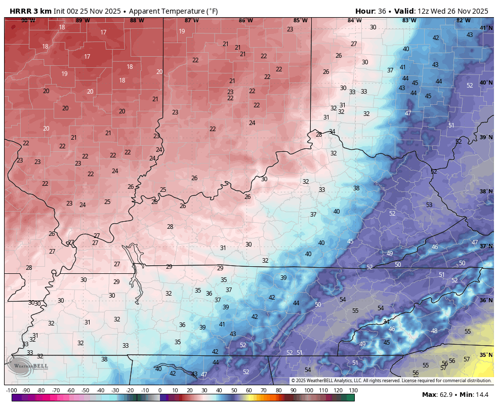 The HRRR is also really aggressive on the cold surging in on Wednesday. This animation shows the temps from 7am to 7pm…