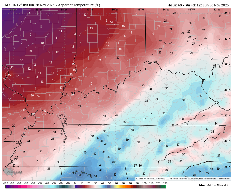 Gusty winds and another blast of frigid air comes crashing in behind this. Wind chills from 7am Sunday to 7am on the 1st day of December Monday are way down there…
