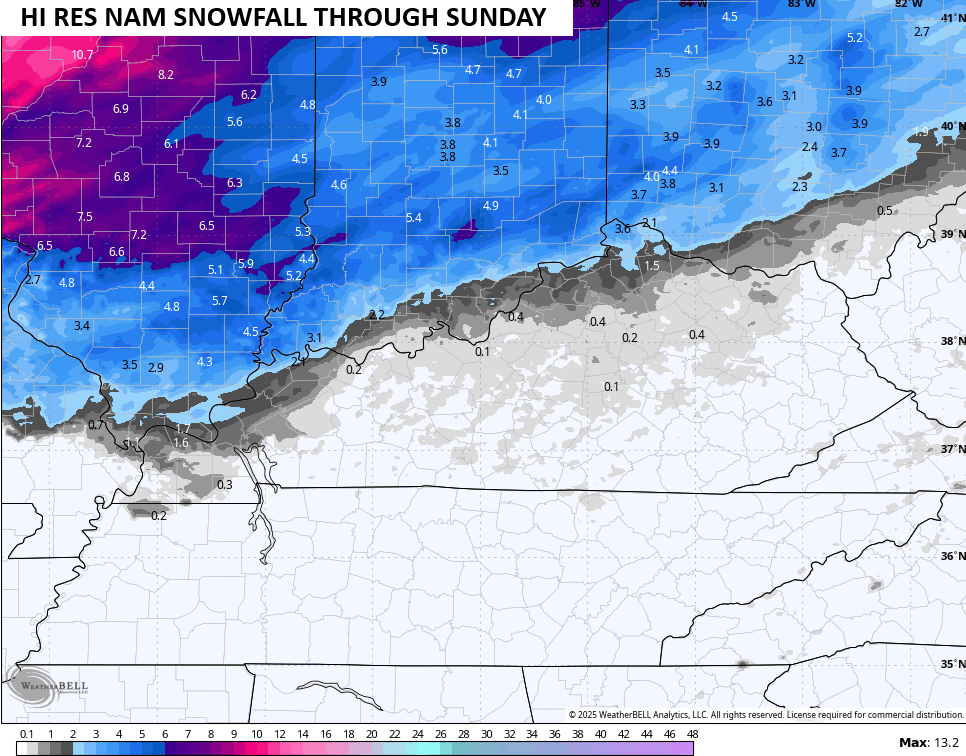 The GFS and Hi Res NAM are similar in their respective snowfall thoughts…