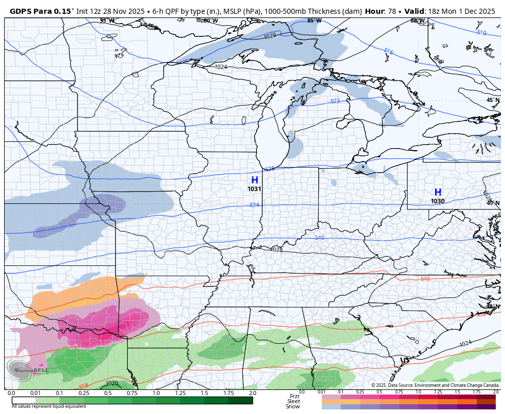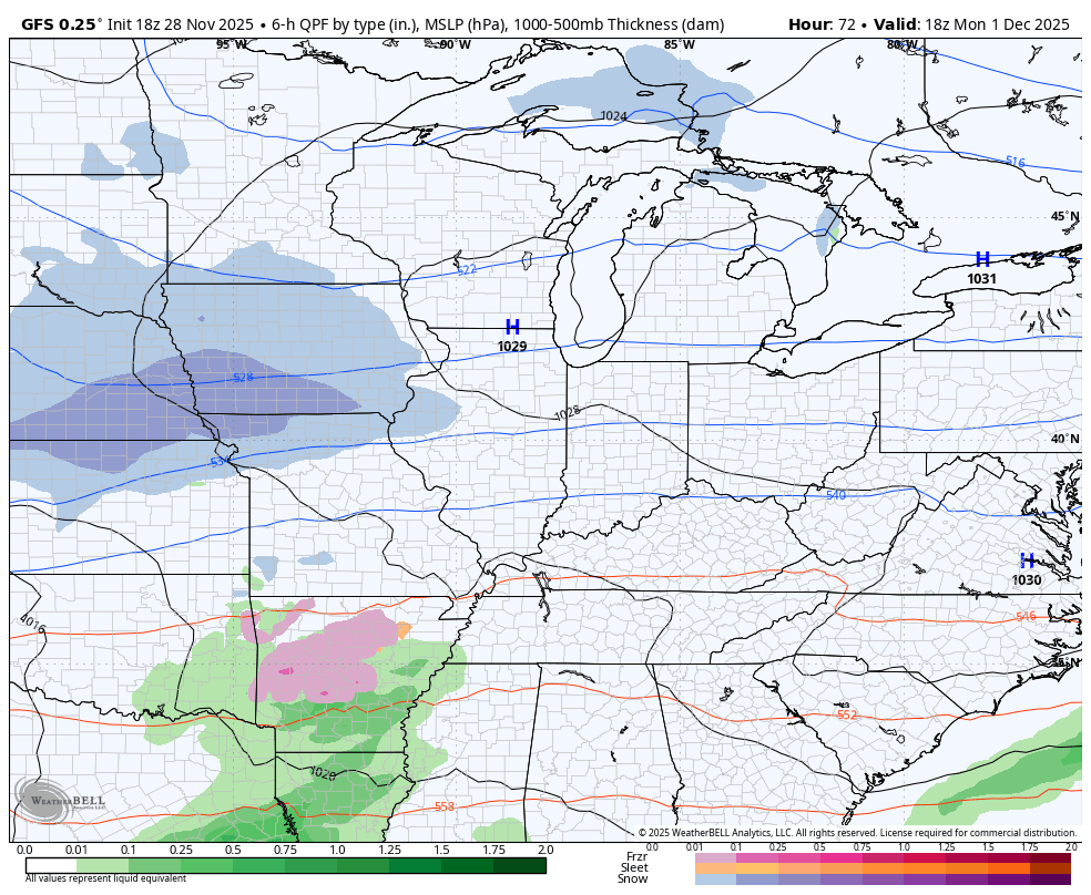 As mentioned, the forecast models won’t get their act together for another day or two. The determining factor on whether you get snow, rain, a mix, freezing rain or nothing will be just how far north that lead low gets into the southern Appalachian Mountains.