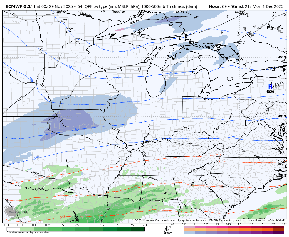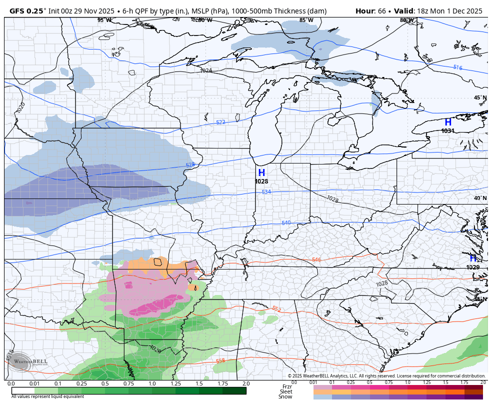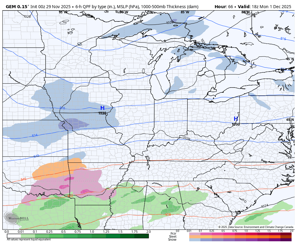The EURO has a similar track with the lead low but does not bring in much freezing rain with only a small mix zone…