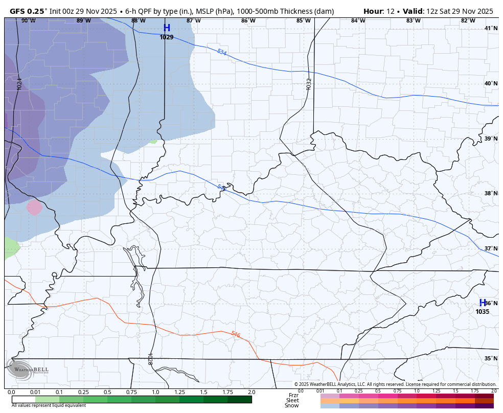 I have no changes to the system moving from west to east out there today. A band of light rain and light snow impacts western Kentucky early today then heads to the east later this afternoon and evening. This thing is moving so quickly that we aren’t getting much warm air advection out ahead of it. That only means a modest temp jump ahead of this system with low and mid 30s in the north and 40-45 in the south.