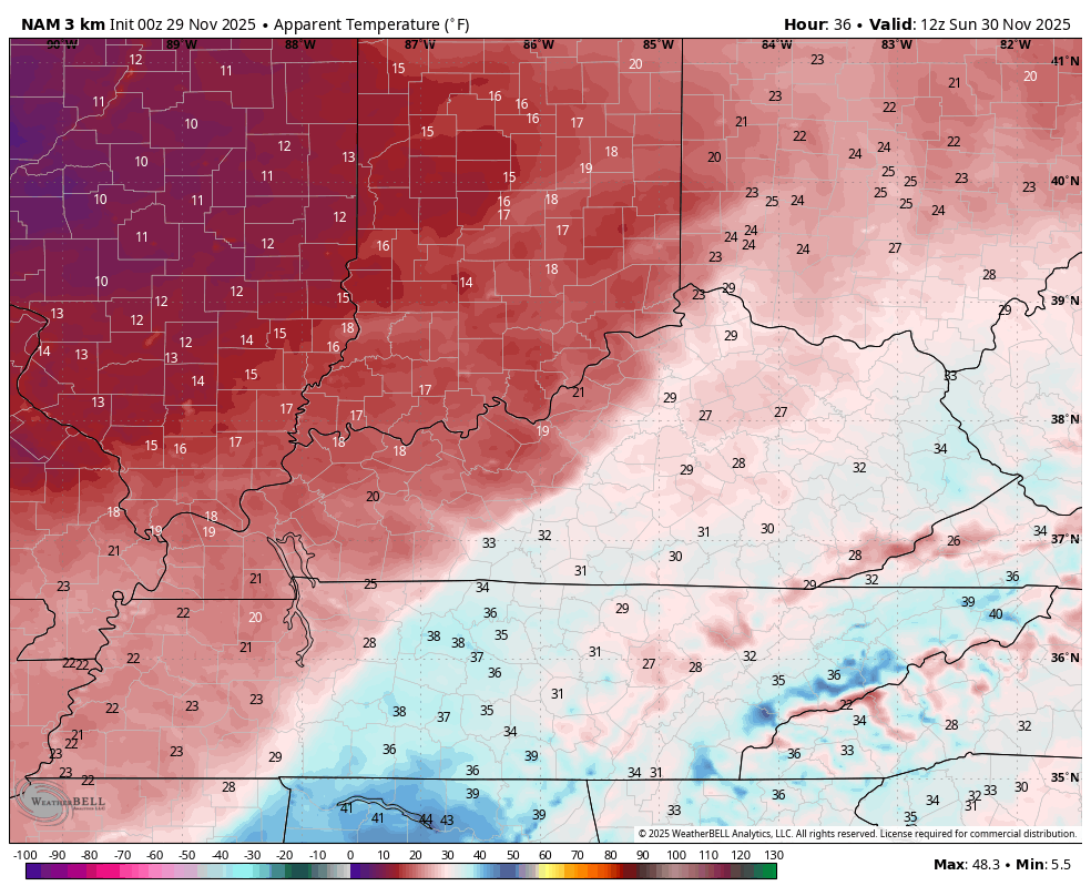 A few flurries will fly behind all this into a windy and frigid Sunday. Temps drop into the upper 20s and low 30s by mid-morning and they stay there through the day. Throw in that strong northwest wind and you get wind chills dropping into the teens. This wind chill animation starts at 7 Sunday morning and ends at 7 Sunday evening…