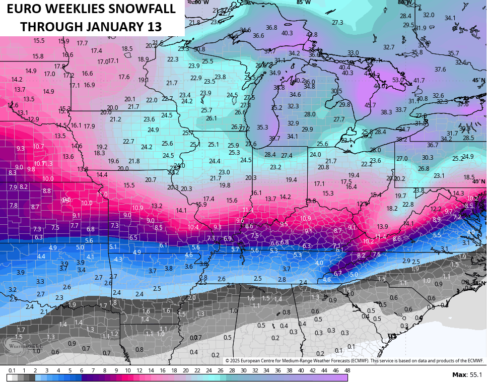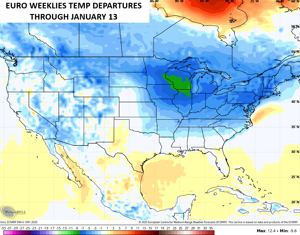 We know December is going to be harsh across the country and now we get the EURO Weeklies going into the middle of January and they keep the cold coming. This is an average of 101 different members that make up the EURO Weeklies…