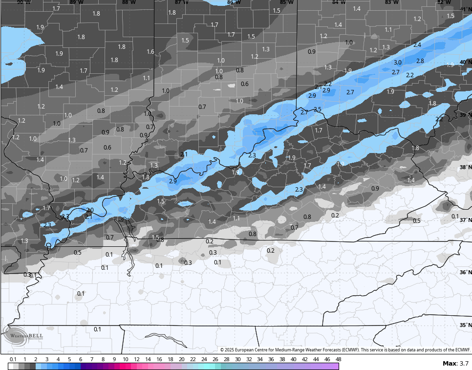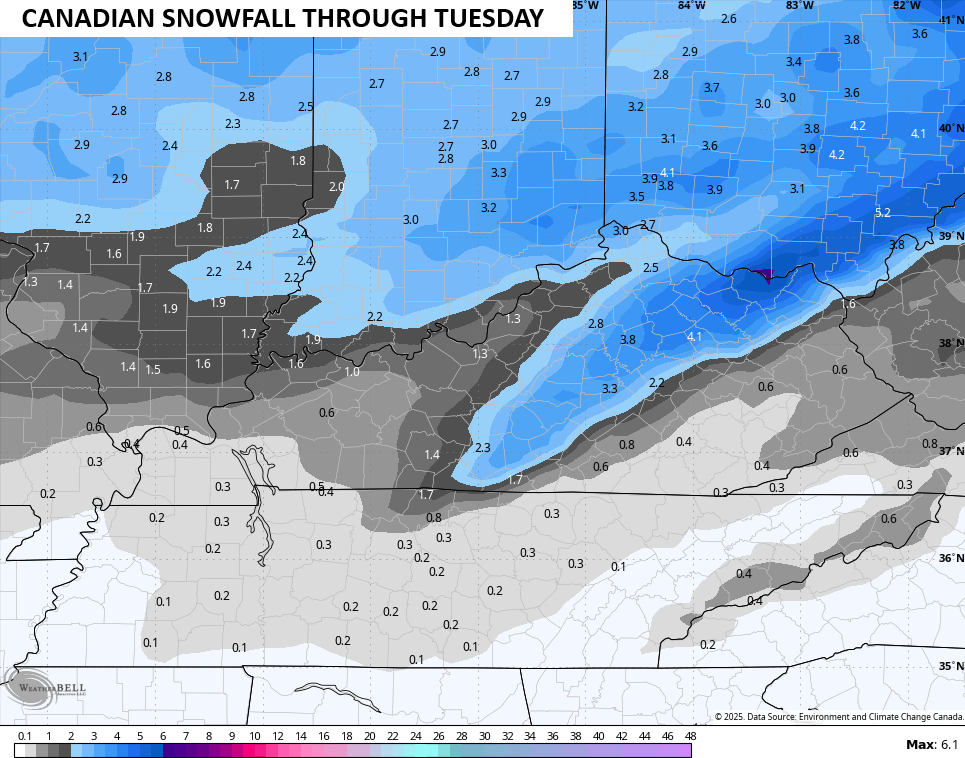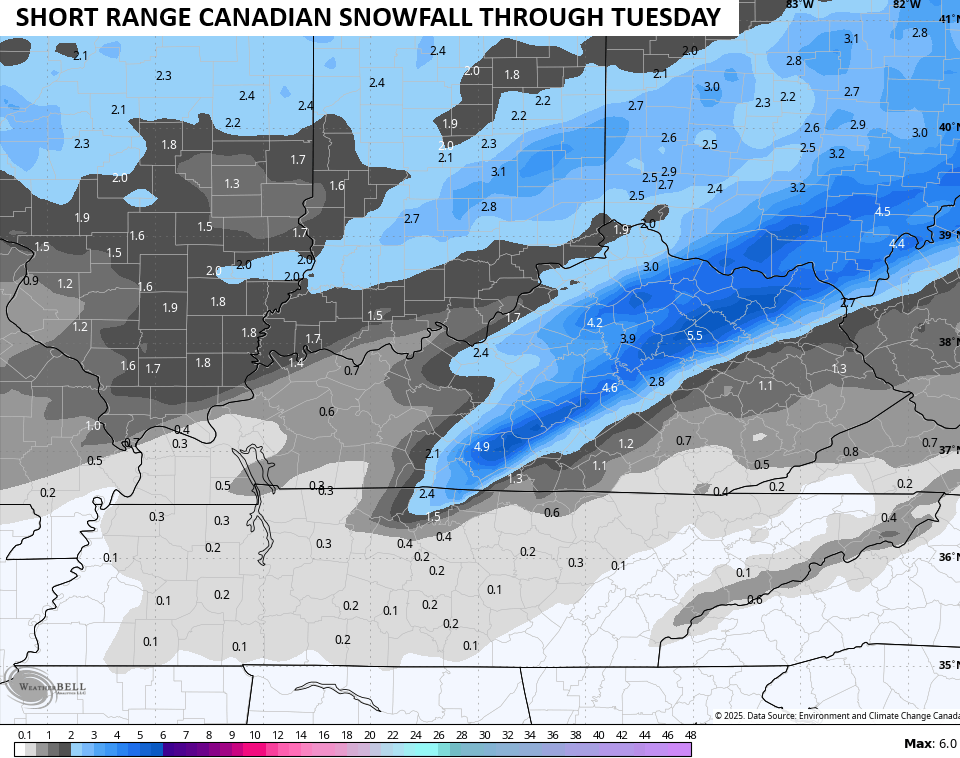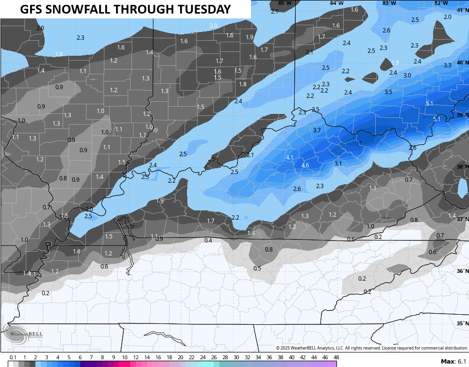 So you can see how the potential is there to push 4″ of snow in some areas. 4″ from a single event is the criteria for a Winter Storm Watch anywhere in Kentucky. I do think a WSW would be warranted for several counties from the Bluegrass Region to northeastern Kentucky.