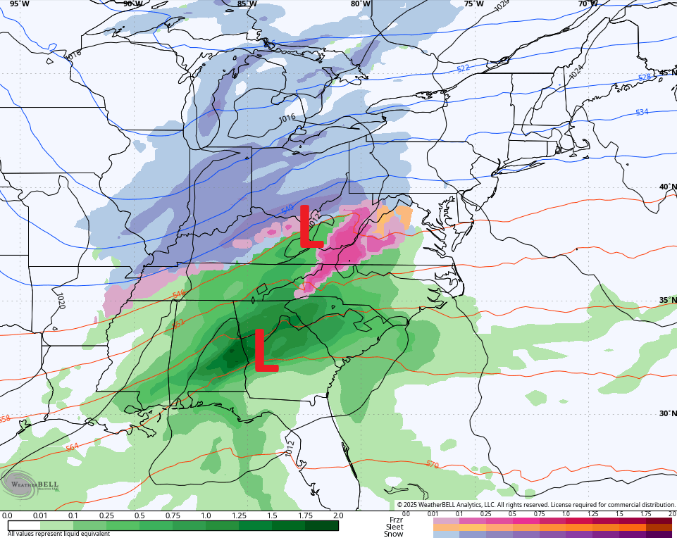 It’s usually a good sign when I start out by saying… I have no real changes to the forecast I already have out. So far, we are seeing things progressing as planned as our lead low works toward the Kentucky/Virginia border Monday night with the main low rolling from the deep south to the Carolinas. Here’s the Monday night look showing these lows…