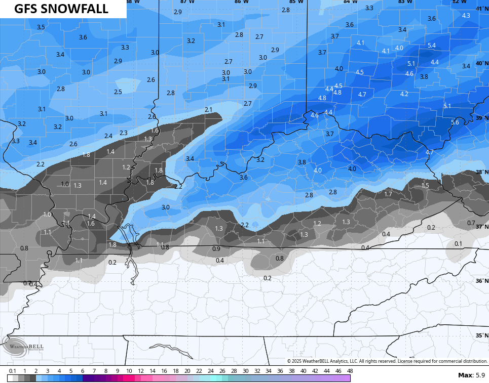 The late afternoon models all decided to trend straight toward what the GFS has been saying for days now and that’s for a heavier and more widespread system. Here’s the latest look from the GFS…