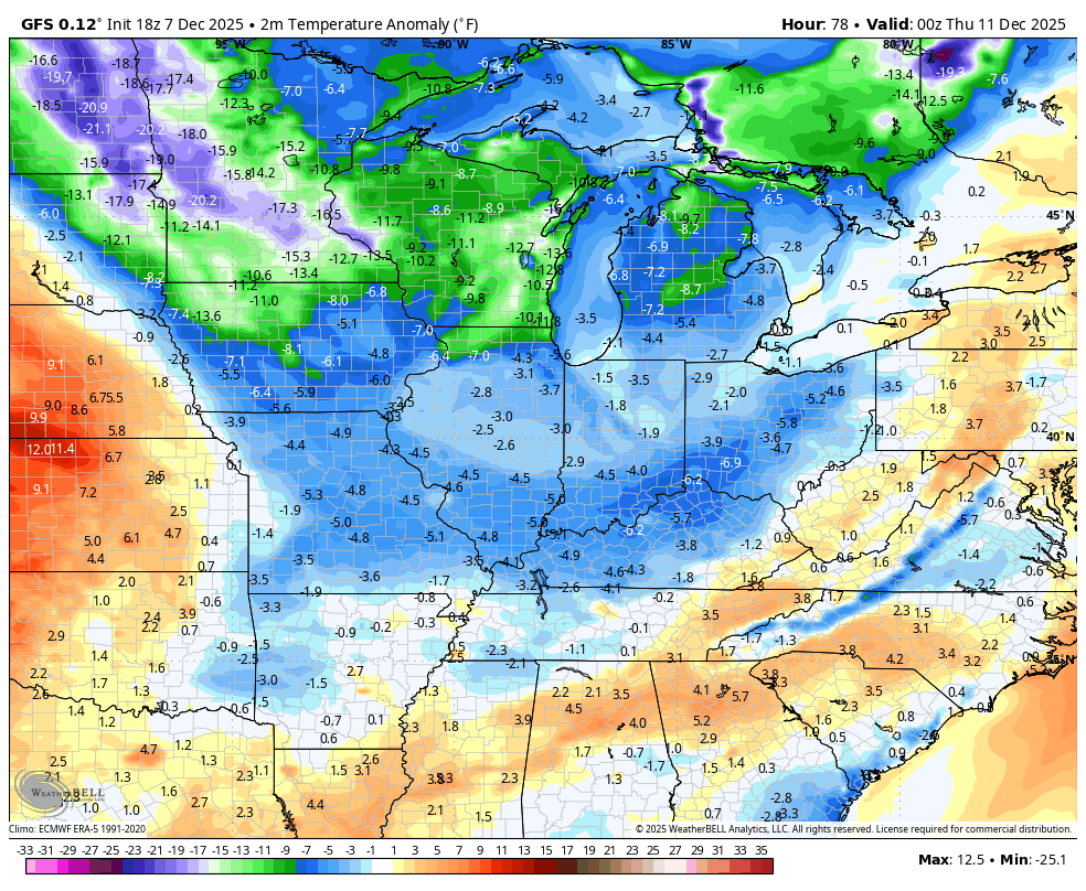 Very cold temps settle in behind this light snowfall and hang into Monday night. Those temps rebound quickly on Tuesday and early Wednesday. This is ahead of the first in a series of clippers diving in. I firmly expect these to produce, at least, some snow in our region.