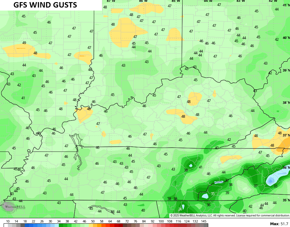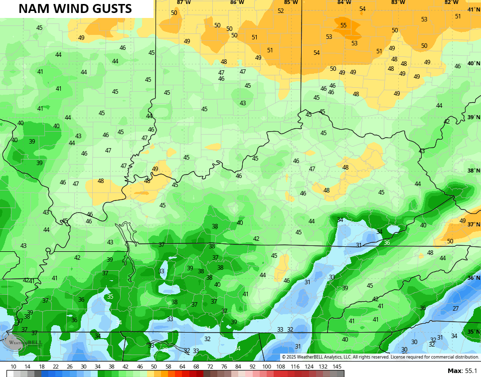 Before he has another chance to do so, we get some big winds in here later Tuesday into Wednesday. 40mph-50mph wind gusts are a good bet for much of the region ahead of an arctic front arriving Wednesday…