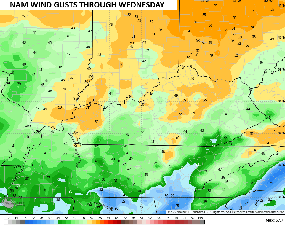 This strong southwest wind should crank as the day wears on with gusts tonight and early Wednesday cranking better than 40mph. Most of the models suggest the potential of gusts approaching 50mph at times.
