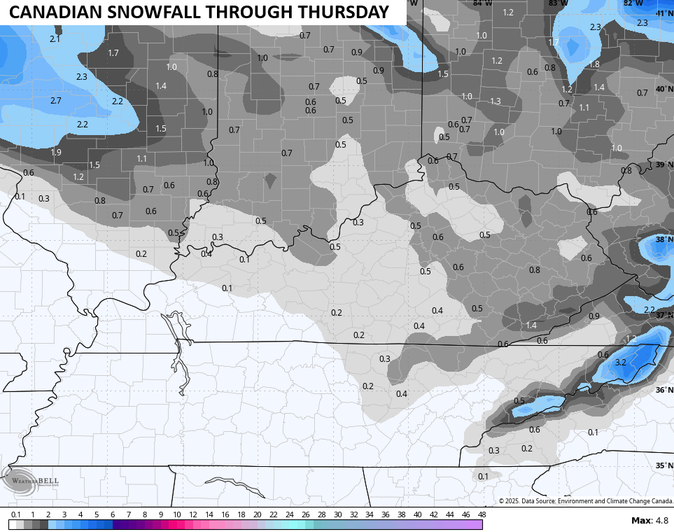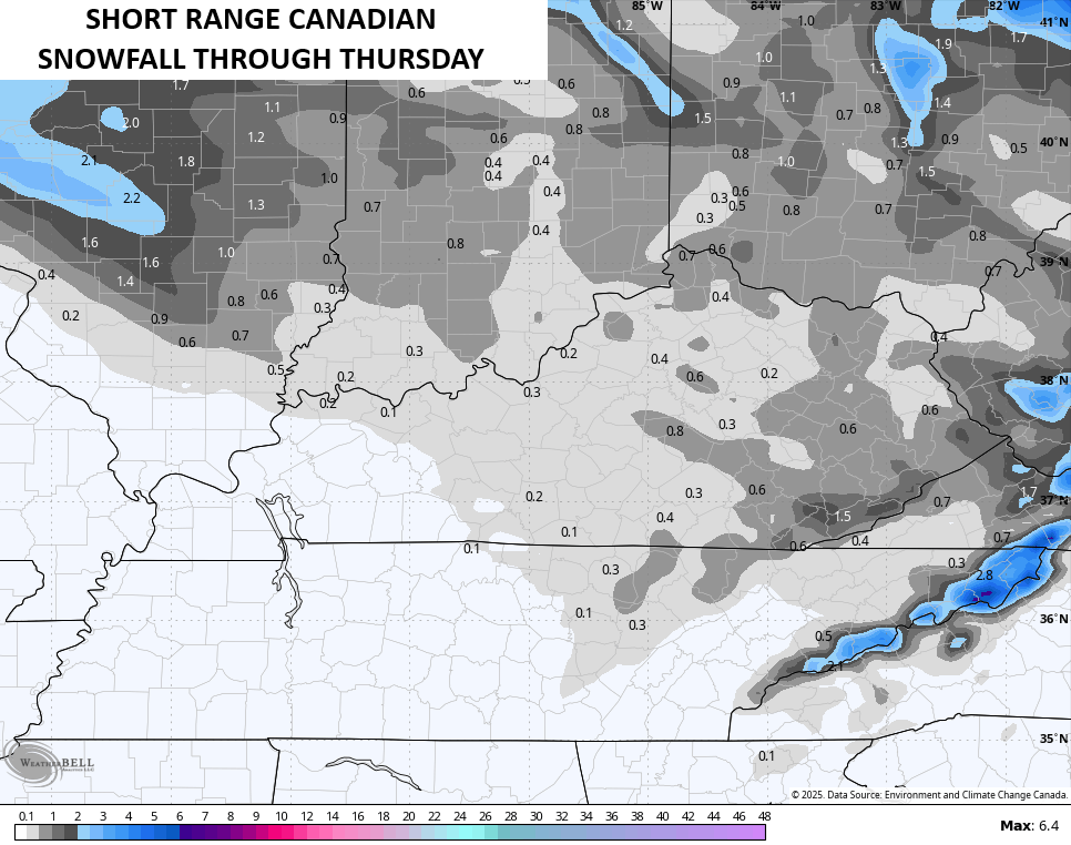 A more widespread swath of snow then dives in from northwest to southeast Thursday night and Friday. The exact placement of this swath is a work in progress, but my thinking is that a fairly extensive swath of 2″-4″ shows up with this.