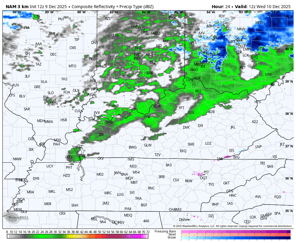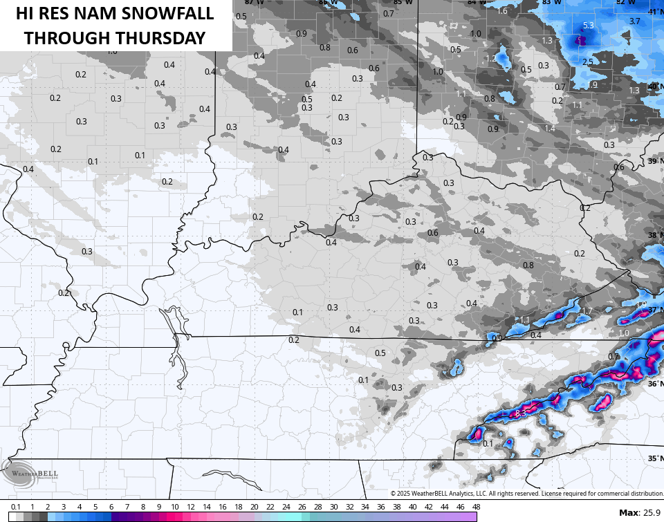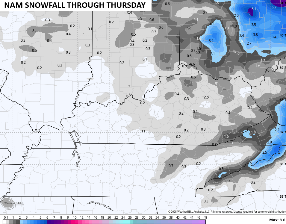These setups get a booster shot from Lake Michigan and can have streaks of up to an inch or snow with higher amounts in the mountains of southeastern Kentucky. The Hi Res NAM is picking up on that…