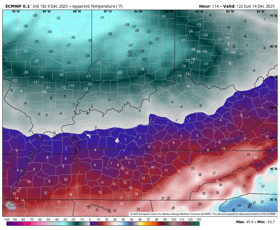 Bitterly cold air crashes in behind that weekend system with lows that can make a run at 0 by Sunday or Monday mornings. Wind chills go well below zero for areas with snow on the ground. Here’s the EURO Wind Chill forecast from 7am Sunday to 7am Monday…