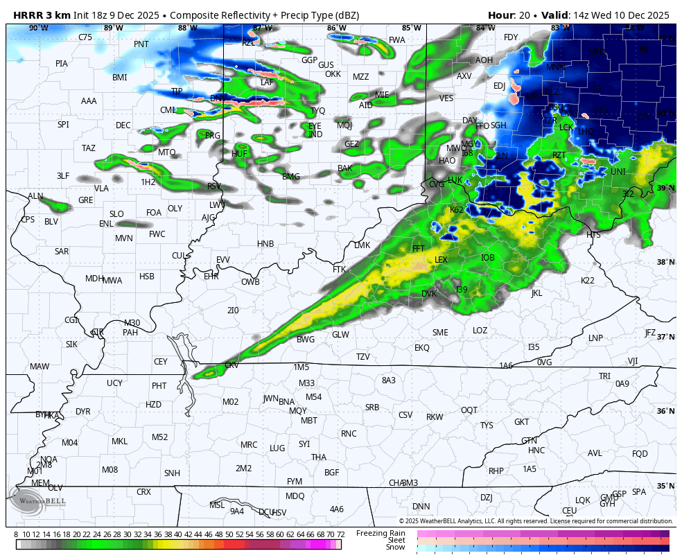 Temps drop all day long Wednesday as gusty showers give way to snow showers and squalls. Those kick in Wednesday evening into early Thursday and some of those may be fairly stout at times. Here’s the HRRR future radar showing all this…