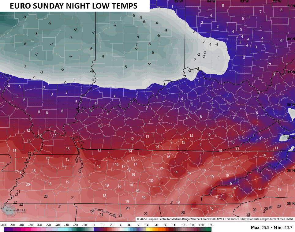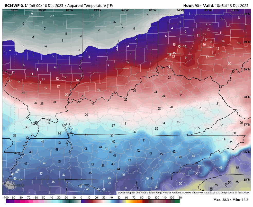 Wind chills behind that system absolutely tank and have the chance to hit Cold Weather Advisory territory. The EURO certainly thinks we do that late Saturday into early Sunday. This wind chill animation starts at 1pm Saturday and goes through 10am Sunday…