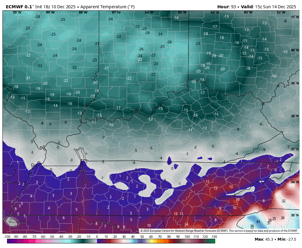 That system moves in with brutally cold air behind it. Highs Sunday may barely get into the low and middle teens for some with lows that can reach 0 or below Sunday morning then again Monday morning. Wind chills will be dangerously cold, folks.