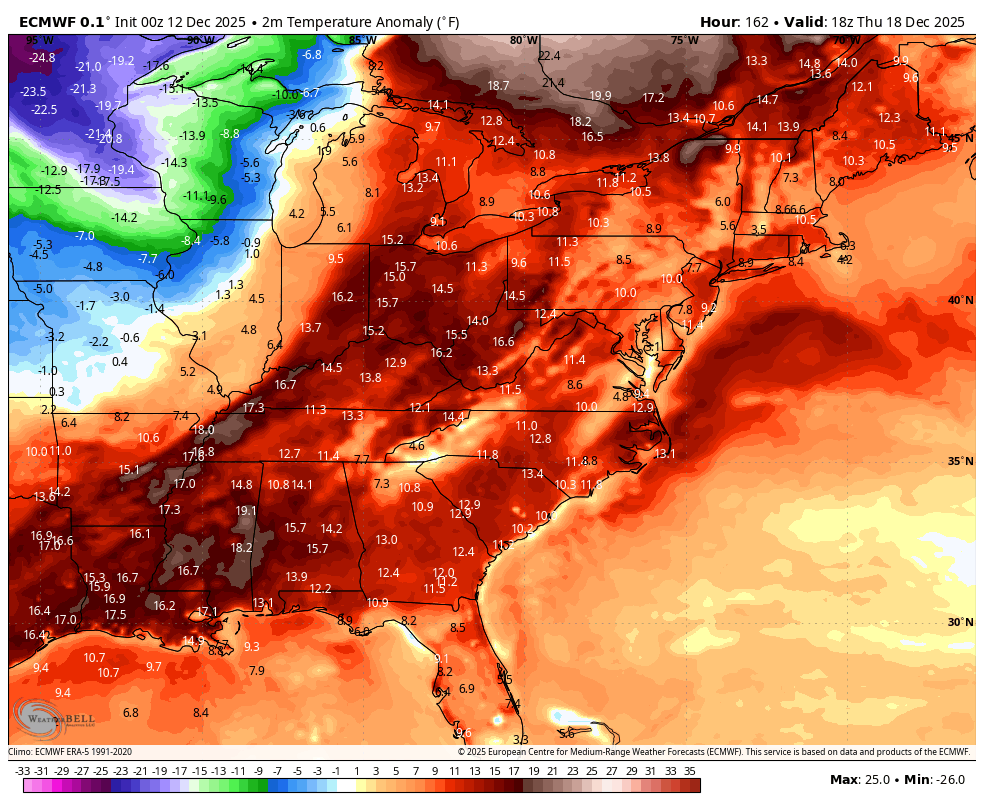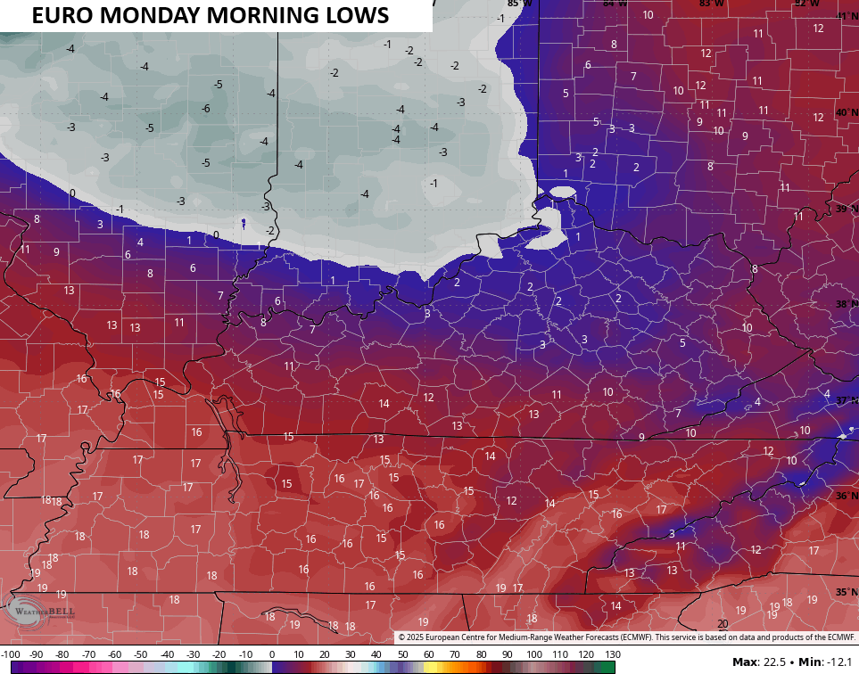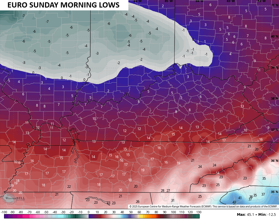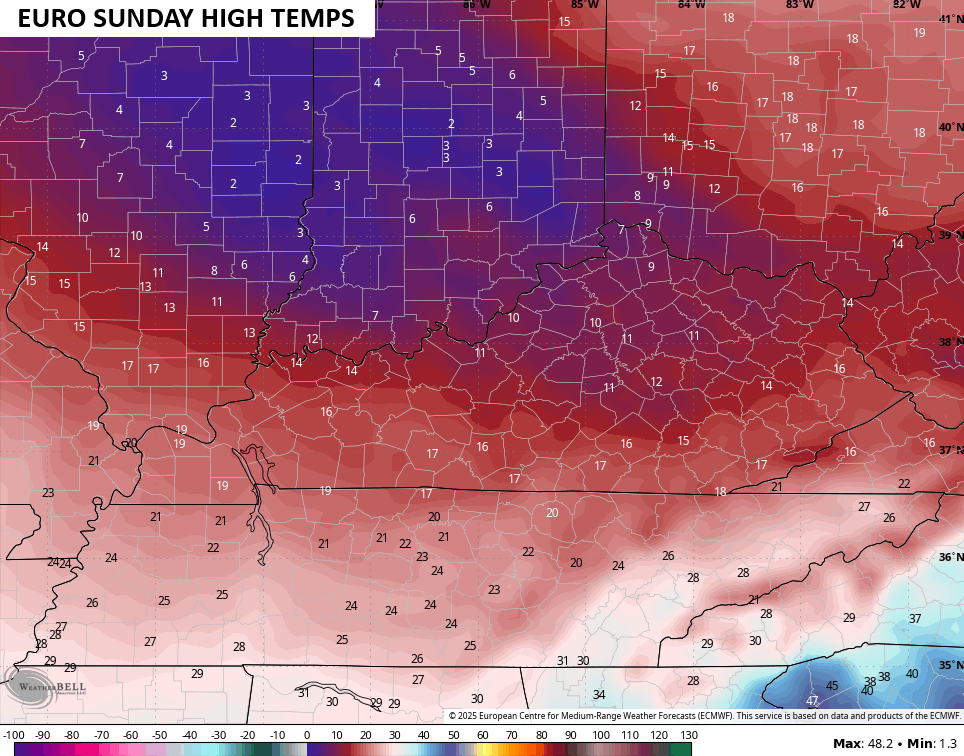 The EURO high temps on Sunday range from the high single digits and low teens over the deep snow, to the mid and upper teens for areas without snow…