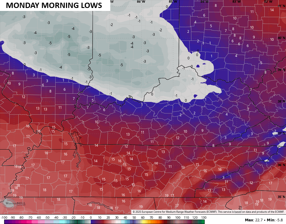 - Actual air temps will range from -5 to 5 above in several areas for Sunday lows and then again for Monday lows.