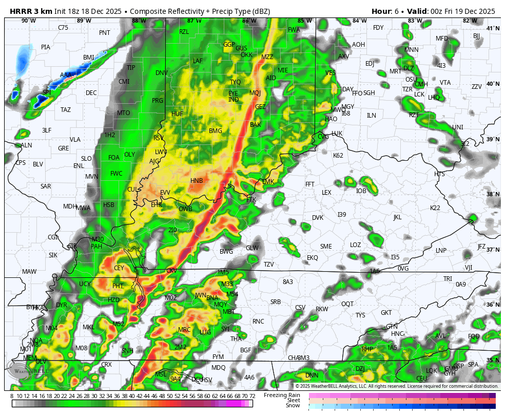 As the squall line races through, temps tank with a second front racing through in the middle of the night. Snow showers and a few snow squalls then roll through here into the first part of Friday. The future radar from the HRRR shows this action well. Our animation goes from 7 this evening through Friday afternoon…