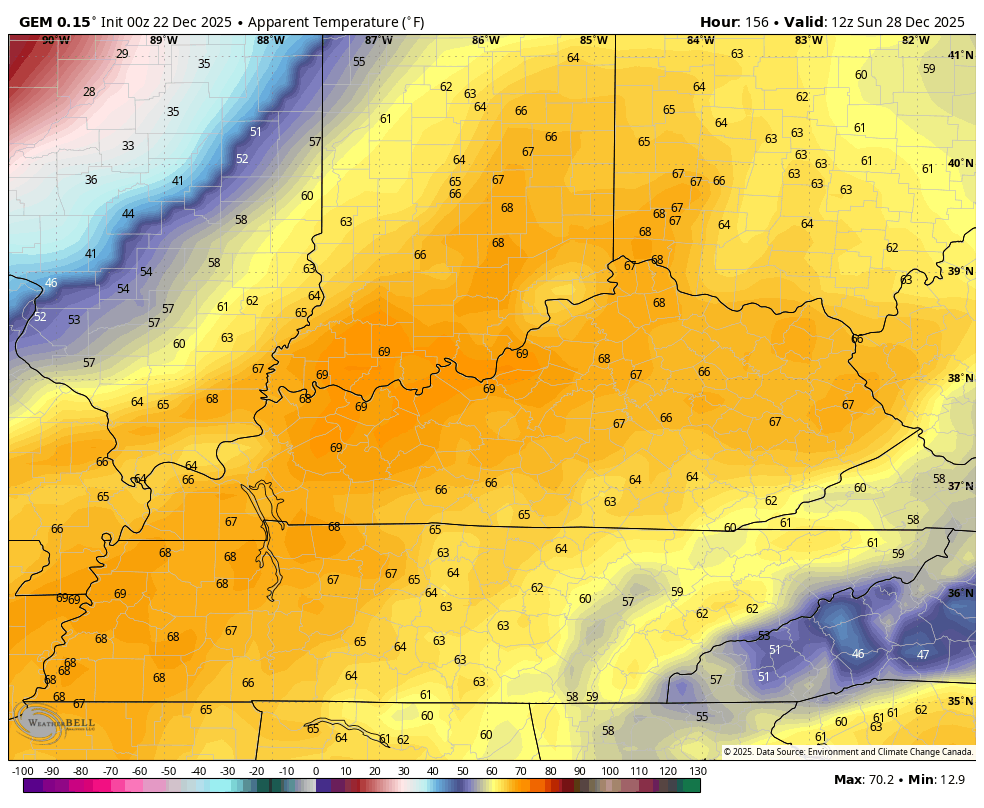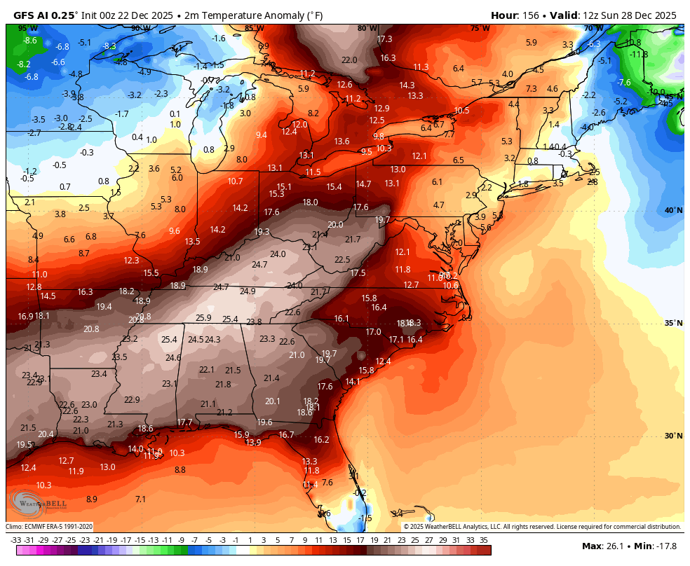 While this week is warm, the Euro isn’t quite as warm as other models for Christmas Eve and Christmas Day. This animation goes from 7pm Christmas Eve to 7pm Christmas Day…