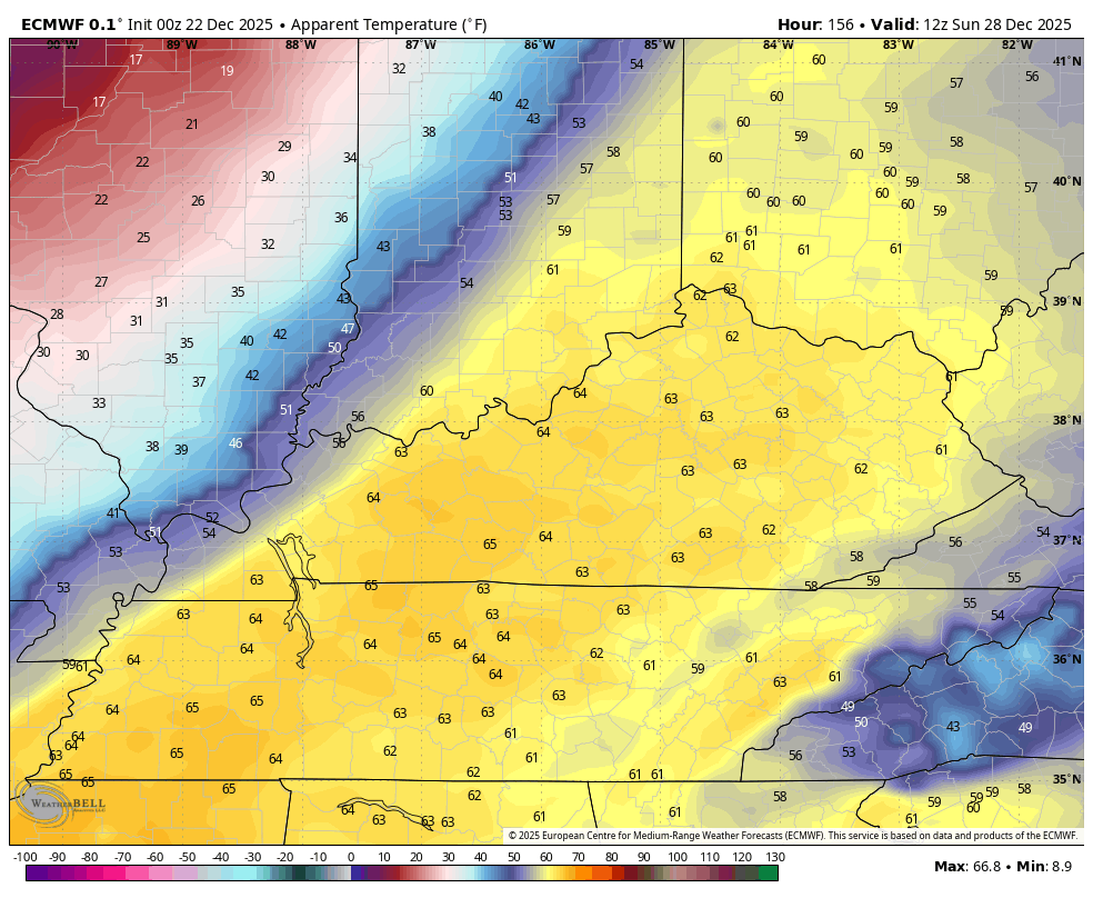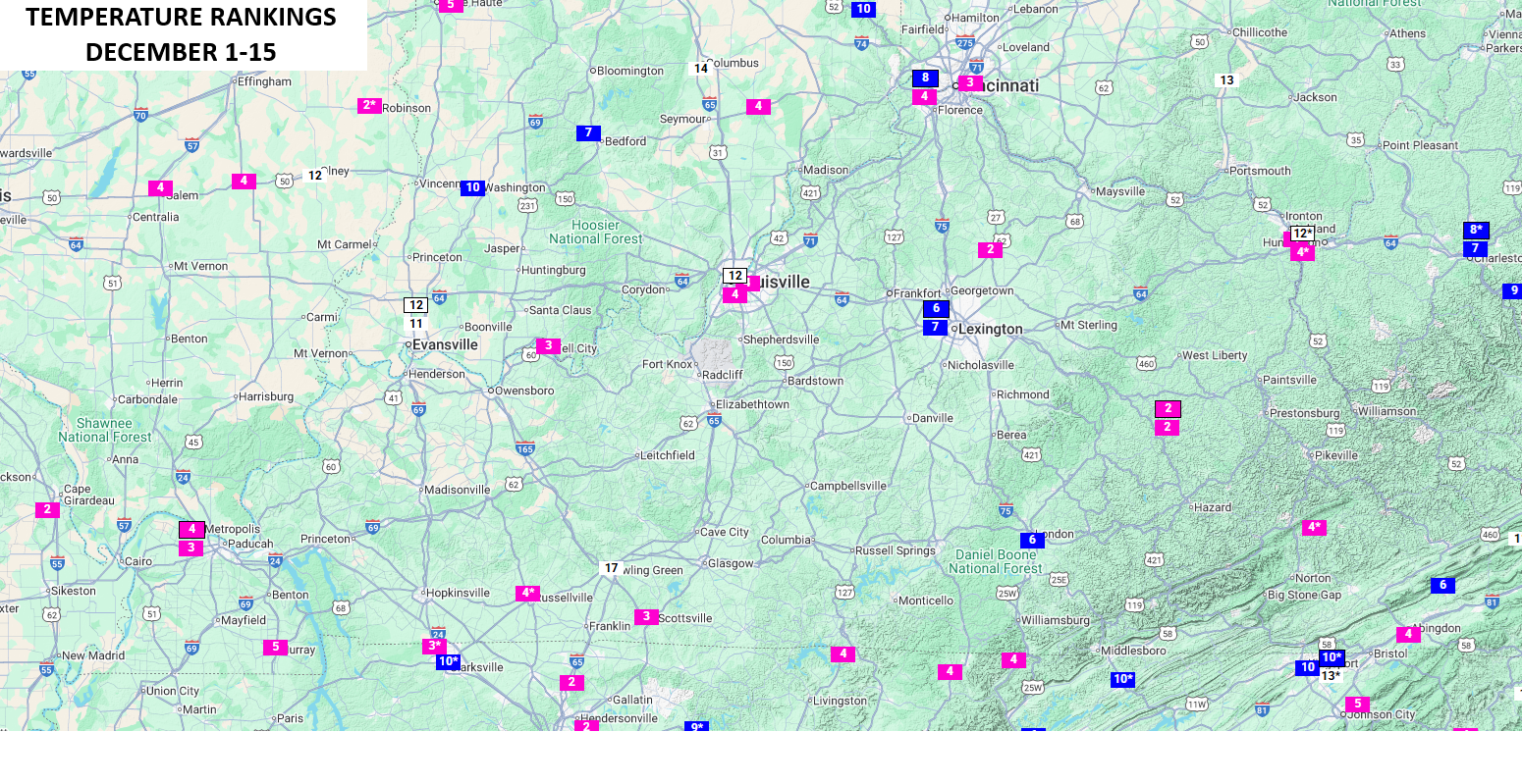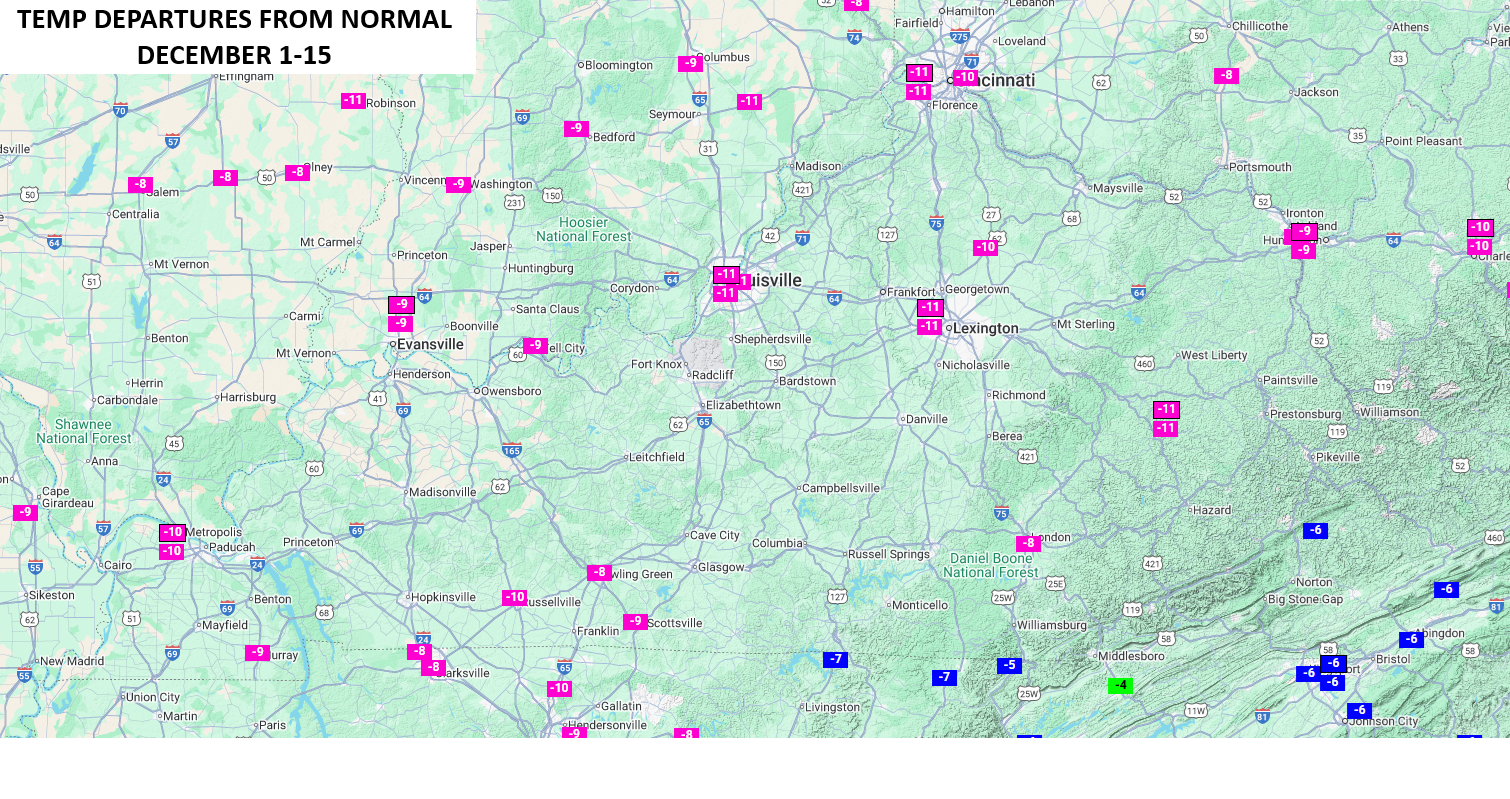 This well above normal temperature setup will do everything in its power to offset one of the coldest first halves of December we’ve ever had here in Kentucky. Look at those temperature departures from normal for the first 15 days of the month…