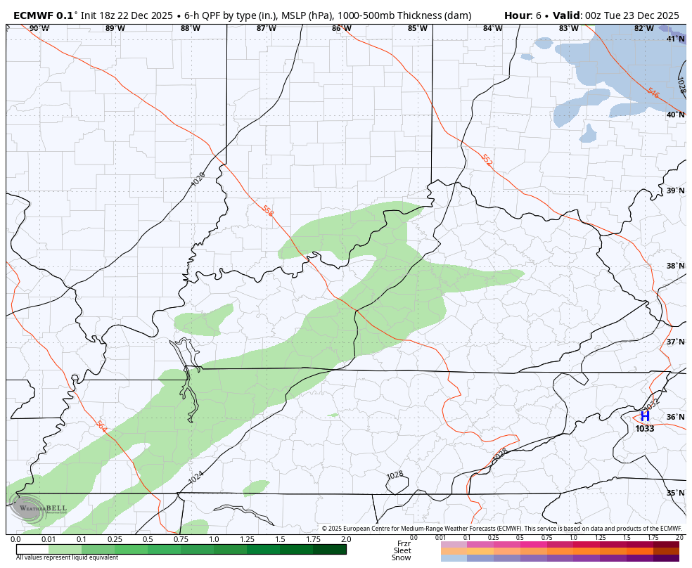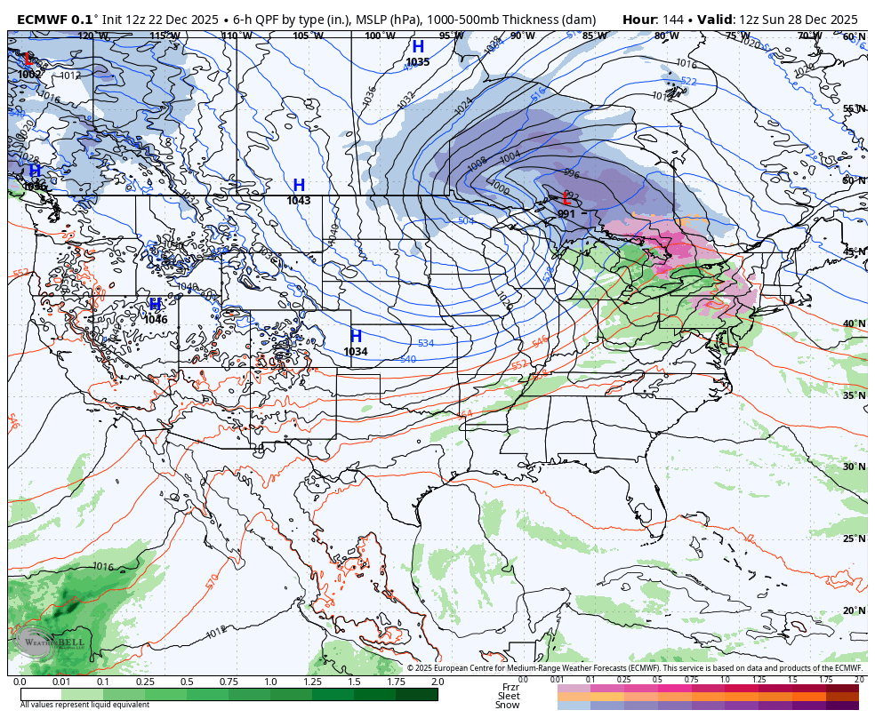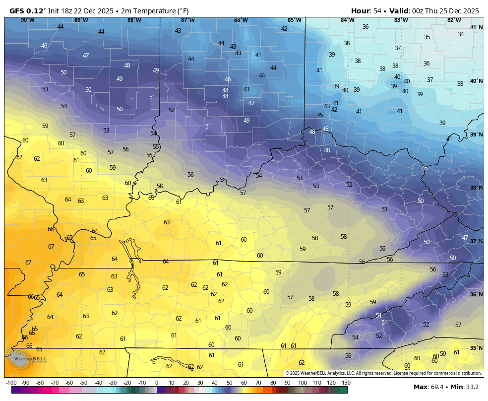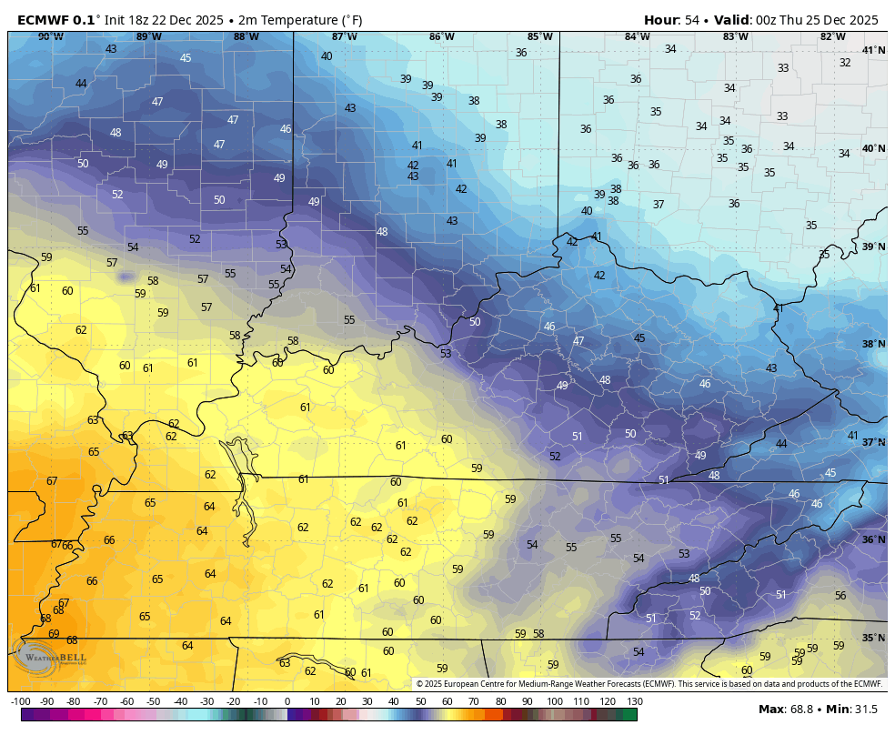 The trend has temps down from prior forecast runs with this boundary setting up from northwest to southeast, setting up a stout temp gradient. Check out the EURO temps from 7pm Christmas Eve through 7pm Christmas Day…