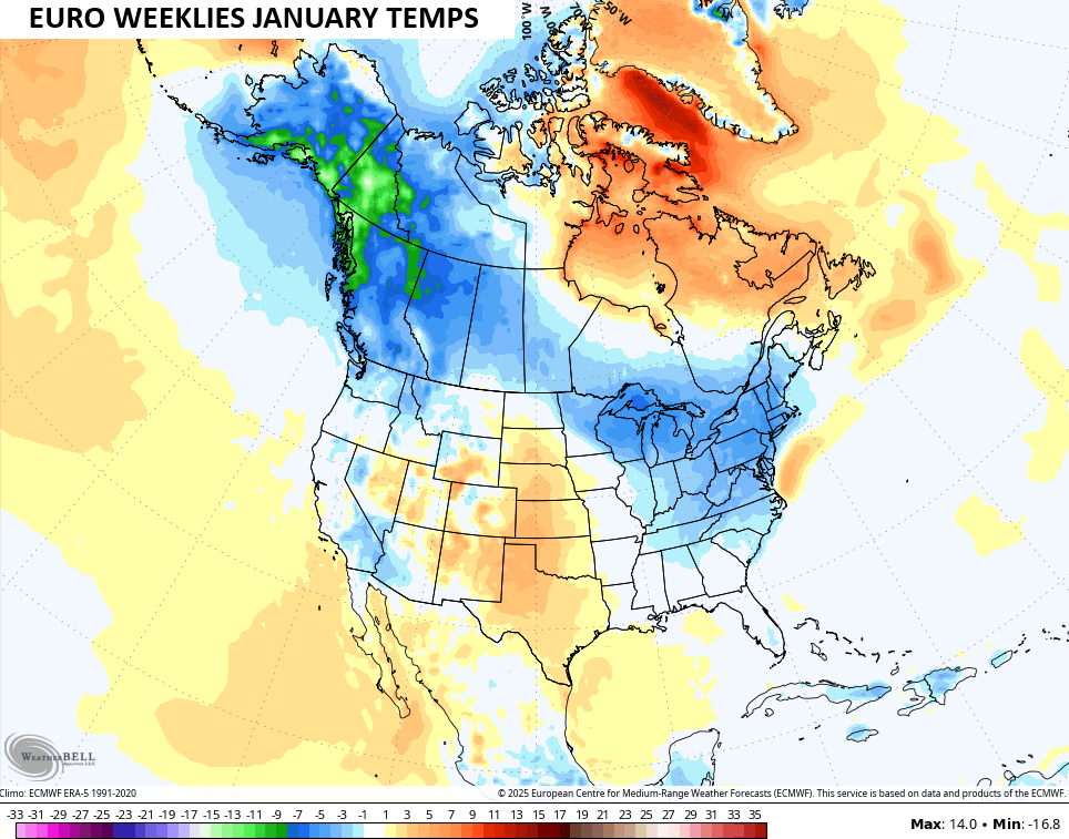 Looking farther down the road with the EURO Weeklies, they’ve had some issues of late, but they’re getting things squared away finally. The temperature map for January shows a familiar pattern with colder than normal temps from Alaska and the Yukon stretching southeastward into the eastern half of the country…
