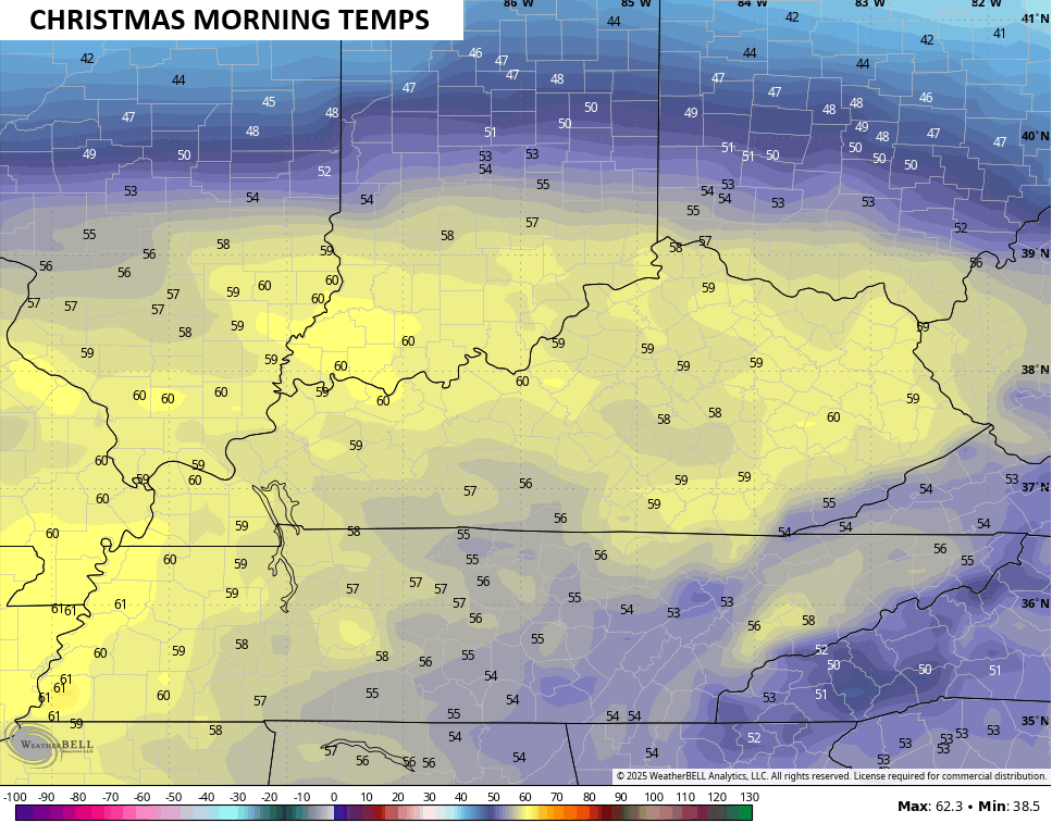 Southwest winds push that boundary to the north tonight, setting us up with a very mild Christmas morning with temps around 60…