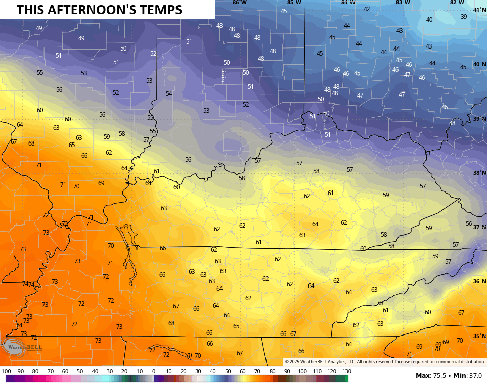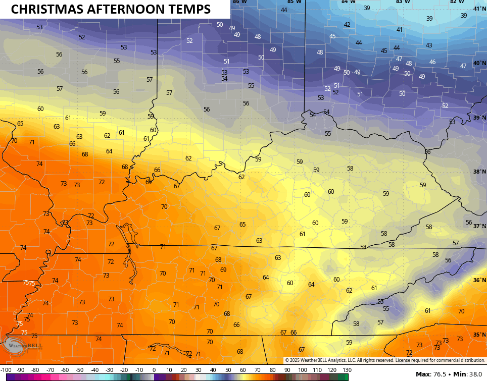 Another big temp gradient sets up Christmas Day, but this one is a bit farther north than the one today. Low and middle 70s may show up in the west…