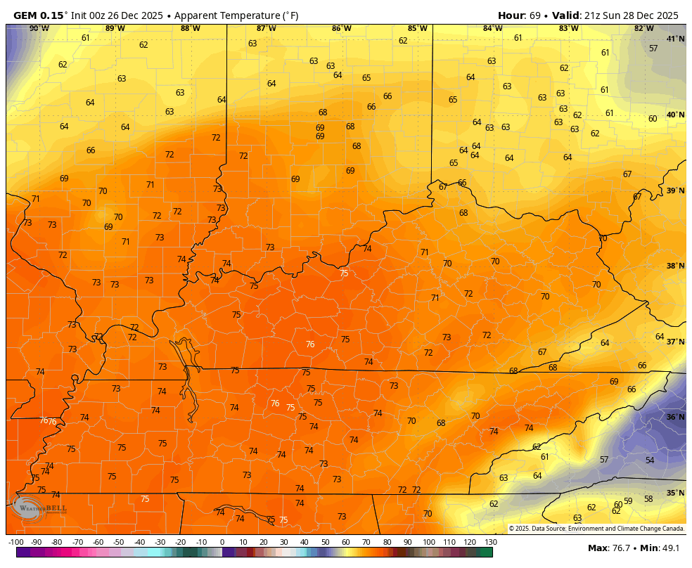 That front heads back to the north on Sunday as a VERY warm southwest wind kicks in. This southwest wind will boost temps to near record or record highs around 70, if not a little better. This is going to be on of the warmest late December days on record.