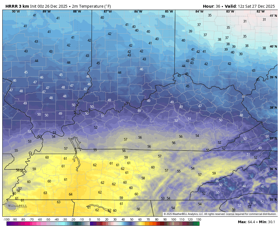 Temps out there today hit the 60s across most of Kentucky with a few showers on the move ahead of our boundary that sags southward through the region tonight. This knocks the temps down some on Saturday, especially across the northern half of the state…