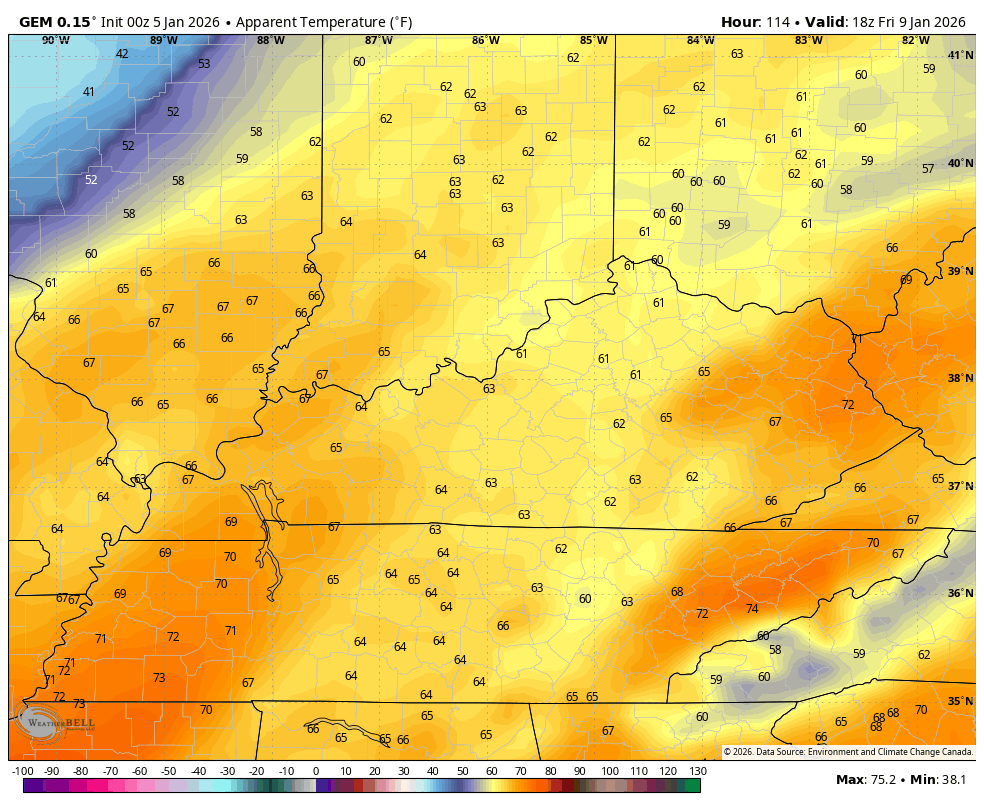 This will be another rude temperature change, but it won’t be as dramatic as the one we had in the closing days of December. Watch the feels like slide from 65-70 Friday afternoon to the low and mid teens late Saturday night and Sunday morning…