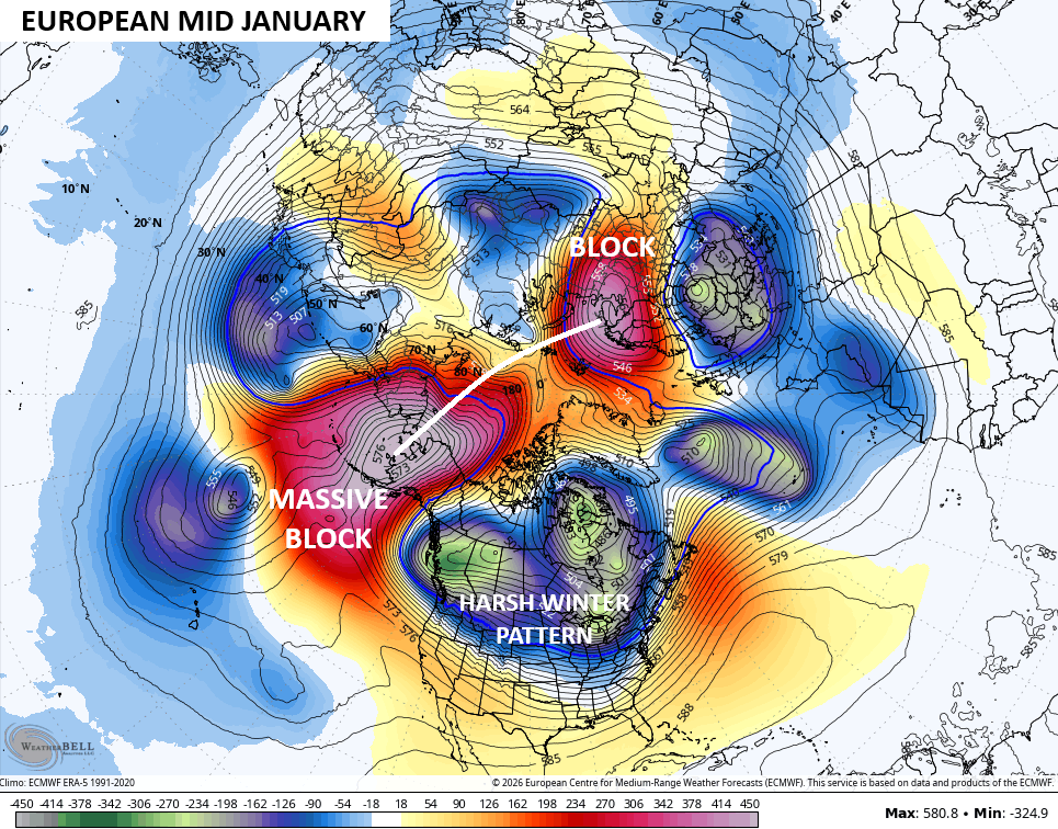 Granted this is still more than a week or so away, but we aren’t looking for details, just the blocking signatures. Those signatures are showing up and showing off on the latest EURO as it has a massive block going up across Alaska that extends through the North Pole and tries to connect to a block over Scandinavia. The end result would force some serious winter weather across much of Canada and the US…