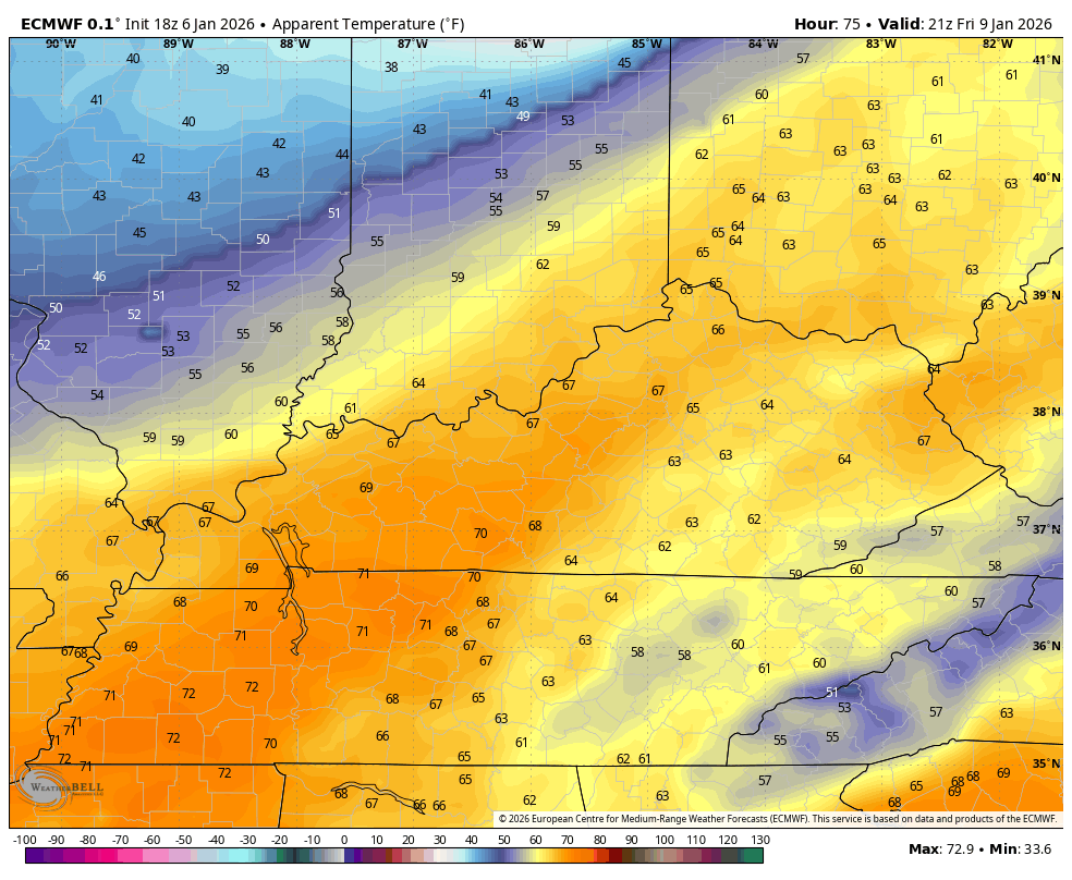 Temps hit deep into the 60s and may push 70 Friday then again in the east on Saturday. As the front blows through, wind chills reach the teens by Sunday morning. This animation shows the feels like from Friday afternoon through Sunday afternoon…