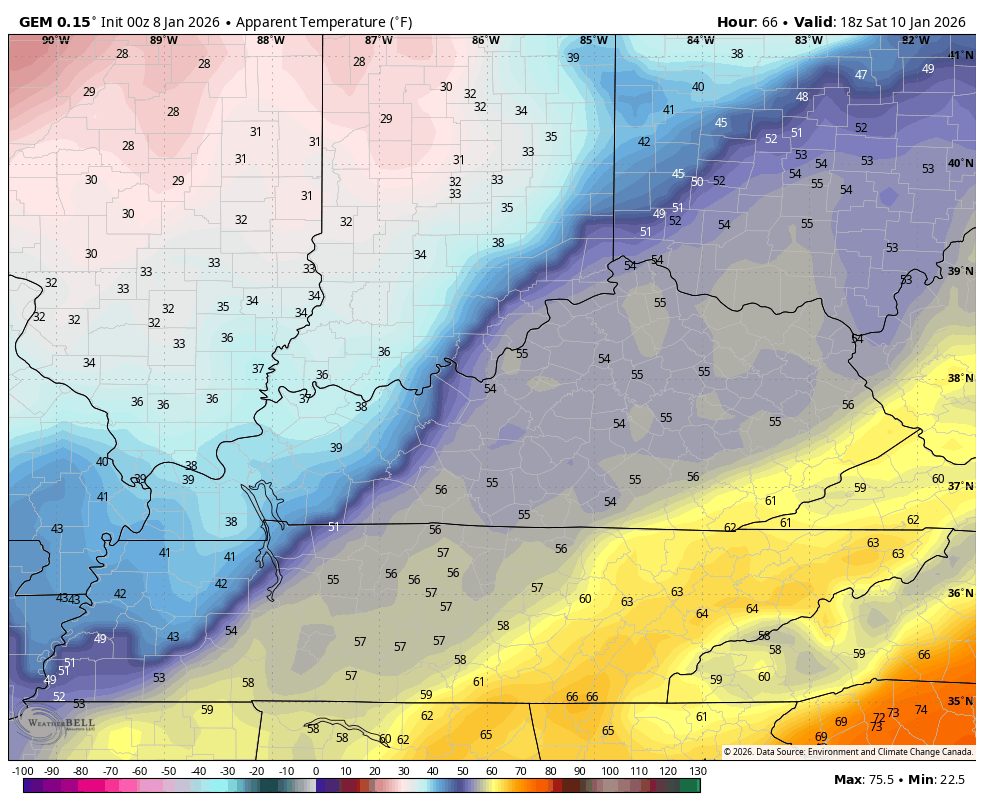 Friday’s temps look a tad cooler than before as that front has a little farther east push to it. Still, most areas reach the 60s with western and northern Kentucky dropping pretty quickly into the 50s behind the front Friday afternoon.
