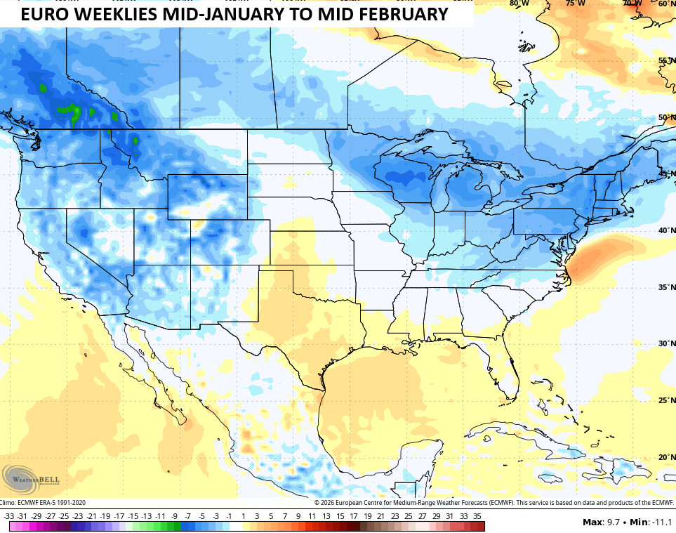 Looking farther down the road from the middle of January through the middle of February, we find the EURO Weeklies swinging back toward a colder than normal look…