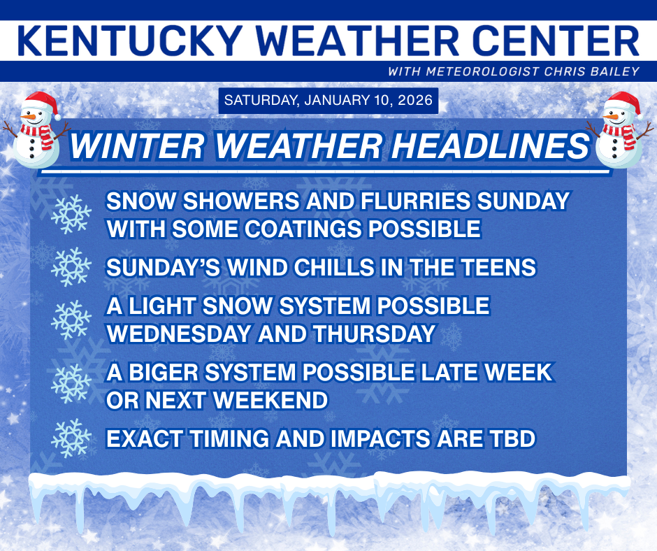 Let’s begin with the cold air streaming in this evening. Rain showers and rolling across central and eastern Kentucky ahead of our cold front with periods of snow showers and light snow coming in behind it tonight and Sunday.