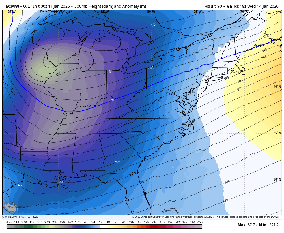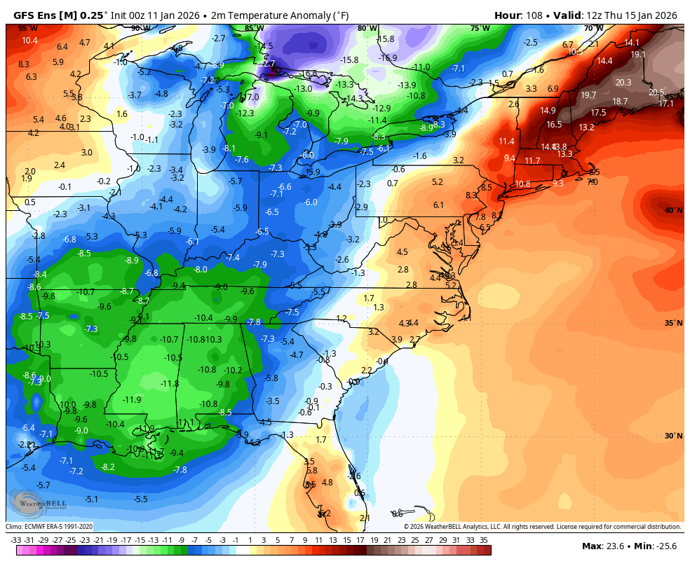 That animation from the GFS Ensembles goes from January 15th to January 20th and is impressive considering some Barney colors are showing up in the average departure forecast.