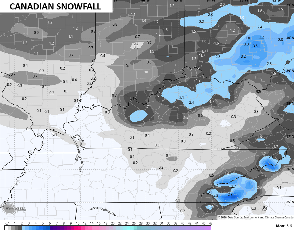 I’m not ready to bite on those just yet because the Canadian Models aren’t quite as snowy. They see the rain lingering a little deeper across the south and southeast, cutting down totals…