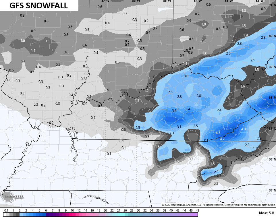In terms of what the models are thinking for snowfall as of this writing, the GFS is a pretty solid hit…