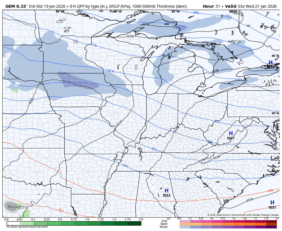 A couple of light systems sweep through here Wednesday into Thursday with the chance for some snow and a mix, depending on where you are. The Canadian shows the light stuff…