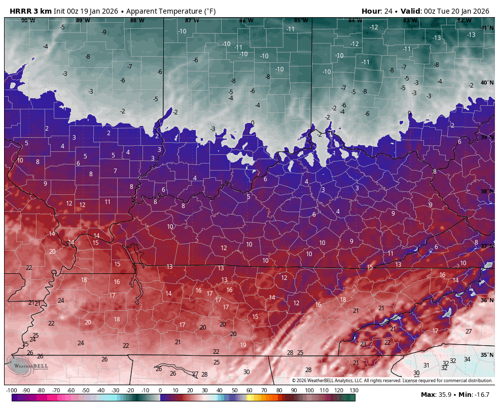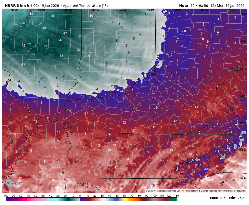 Another arctic front sweeps across the Ohio Valley today, bringing some early day flakes to the north and northeast. Temps may actually drop some through the morning with te numbers generally staying in the upper teens and low 20s for many. Wind chills today are brutal, and this animation shows what I’m talking about. This runs from 7am to 7pm…